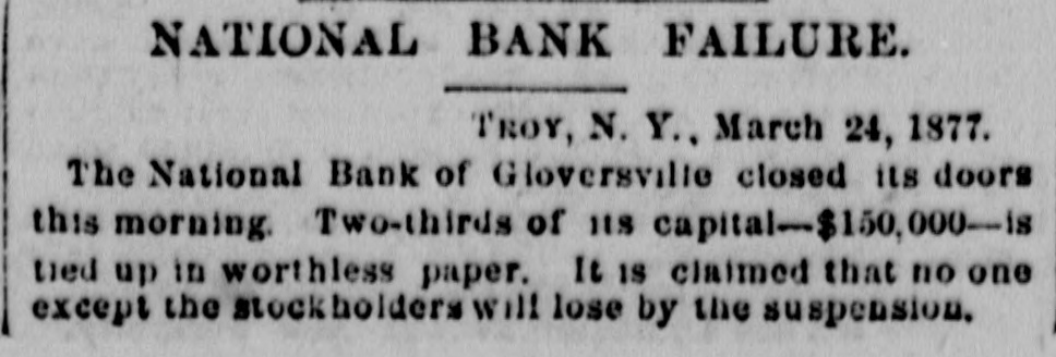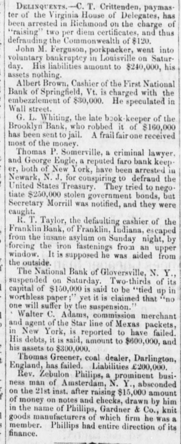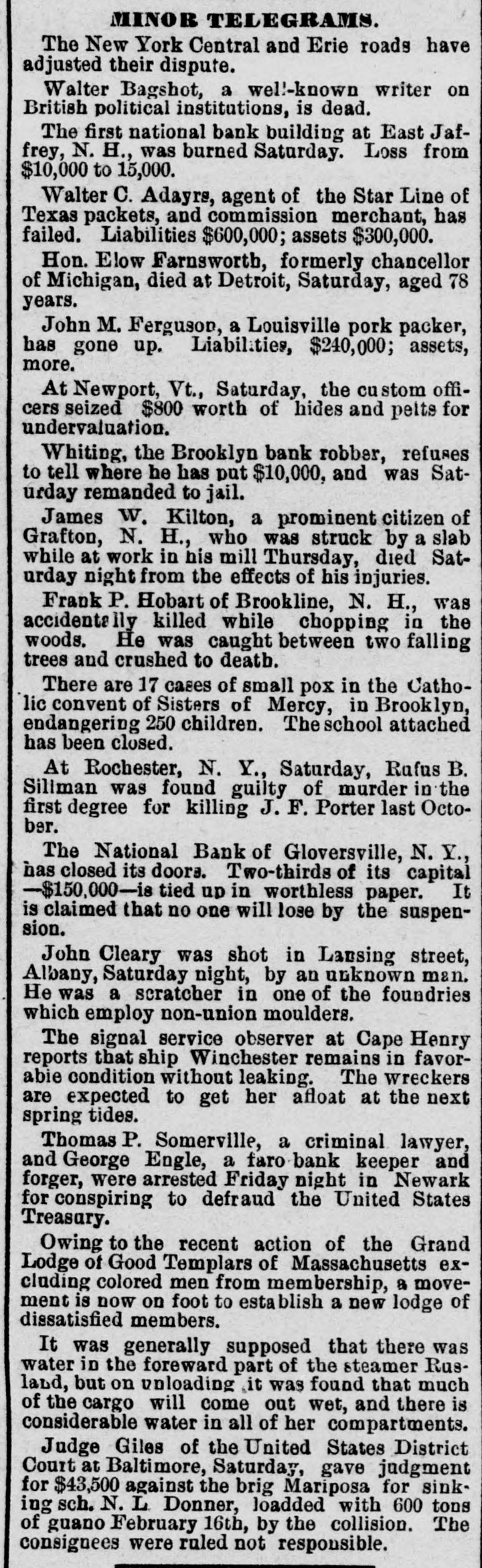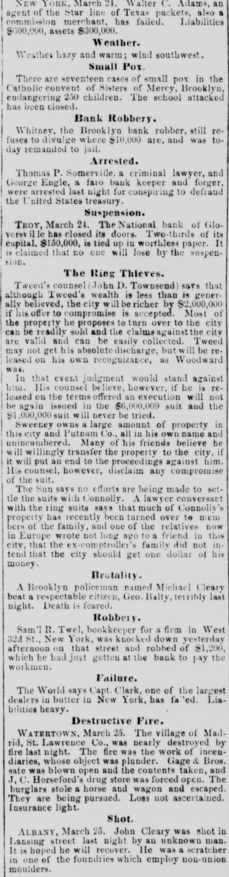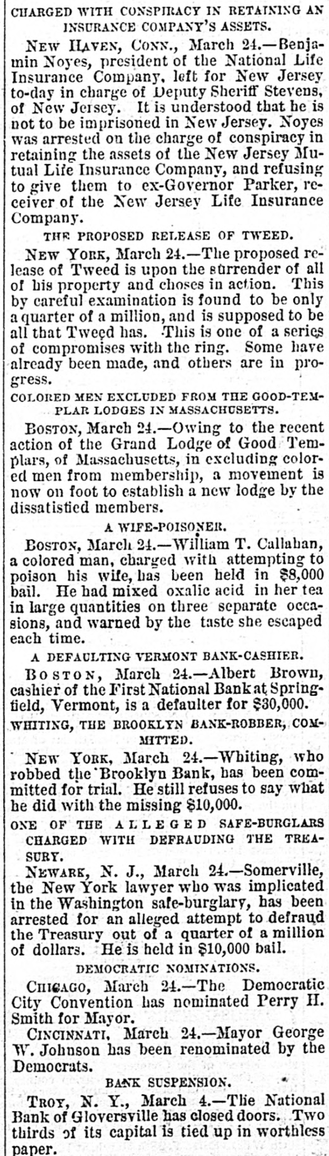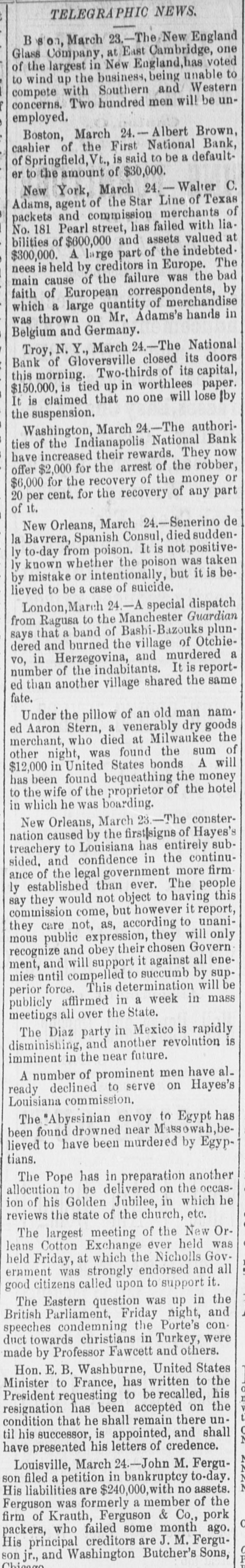 TELEGRAPHIC NEWS. Boson, March 23.-The New England Glass at East one of in New voted the Company, largest England,has Cambridge, unable to wind up the business, being to with Southern Two hundred men uncompete concerns. and will Western be employed. Boston, March 24. - Albert Brown, the First Bank, of is said to be a cashier Springfield, of National defaulter to the amount of $30,000. March 24. New York, Line Walter of of the Star Texas commission of has Adams, packets 181 agent and Pearl street, failed merchants with liaand assets at A part of $300,000. bilities No. of $600,000 large the indebted. valued The nees is held creditors in Europe. main of the failure was bad faith of cause European by correspondents, the by on Mr. in was which thrown a large quantity Adams's of merchandise hands Belgium and Germany. Troy, N. Y., March 24.-The National of Gloversville closed its doors this Two-thirds Bank morning. up worthlees of its capital, $150.000, is tied in paper. It is claimed that no one will lose by the suspension. March authorities Washington, of the Indianapolis 24.-The National Bank have increased their rewards. They now offer $2,000 for the arrest of the robber, $6,000 for the recovery of the money or 20 per cent. for the recovery of any part of it. March 24.-Senerino de la New Bavrera, Orleans, Spanish Consul, died ly from poison. It is not positively whether the was to-day known mistake intentionally, poison but it taken is beby or lieved to be a case of suicide. London, March 24.-A special dispatch from to the a band of says that Ragusa Manchester Bashi-Bazouks of Guardian Otchie- plunburned the village and a vo, dered in and Herzegovina, murdered It is number of the indabitants. reported than another village shared the same fate. Under the pillow of an old man named Aaron Stern, a venerably dry goods merchant, who died at Milwaukee the other night, was found the sum of $12,000 in United States bonds A will has been found bequeathing the money to the wife of the proprietor of the hotel in which he was boarding. New Orleans, March 23.-The consternation the Hayes's to Louisiana treachery caused by first/signs has in the entirely of continu- subsided, confidence ance the government more ly than ever. established of and legal The having people firm- this say they would not object to commission come, but however it report, as, according to unanimous only and recognize they care public not, expression, obey their chosen they will Govern and will support enemies to supment, until compelled it succumb against all by will force. This determination be affirmed in a mass perior publicly the State. week in meetings all over Diaz in rapidly The party Mexico revolution is disminishing, and another is imminent in the near future. A number of prominent men have already declined to serve on Hayes's Louisiana commission. The "Abyssinian envoy to Egypt has been found drowned near Massowah,believed to have been murdered by Egyptians. The Pope has in preparation another allocution to be delivered on the occasion of his Golden Jubilee, in which he reviews the state of the church, etc. The largest meeting of the New Orleans ever was held at ernment all Friday, Cotton was Exchange strongly which the endorsed Nicholls held and Govgood citizens called upon to support it. The Eastern question was up in the British Parliament, Friday night, and speeches condemning the Porte's conduct towards christians in Turkey, were made by Professor Fawcett and others. Hon. E. B. Washburne, United States Minister to France, has written to the President requesting to be recalled, his resignation has been accepted on the condition that he shall remain there until his successor, is appointed, and shall have presented his letters of credence. Louisville, March 24.-John M. Ferguson filed a petition in bankruptcy to-day. His liabilities are $240,000,with no assets. Ferguson was formerly a member of the firm of Krauth, Ferguson & Co., pork packers, who failed some month ago. His principal creditors are J. M. Ferguson jr., and Washington Butcher's Sons,