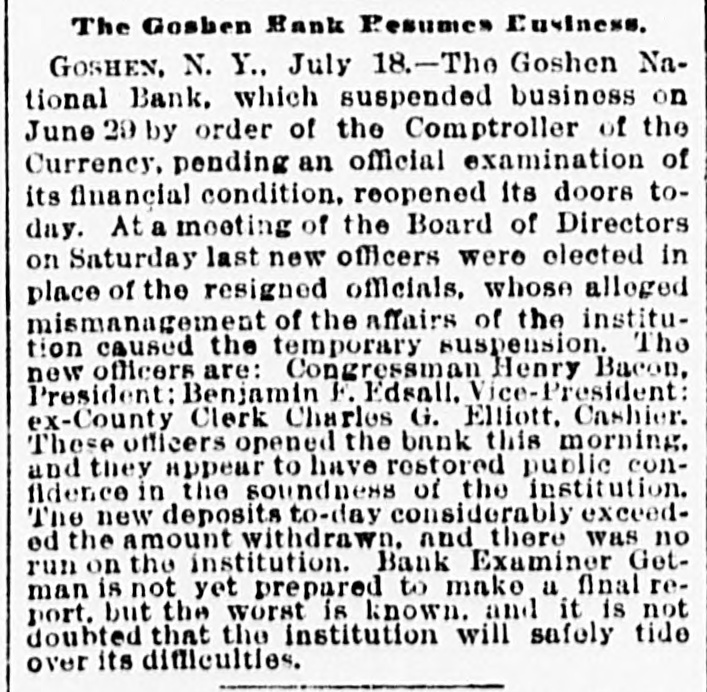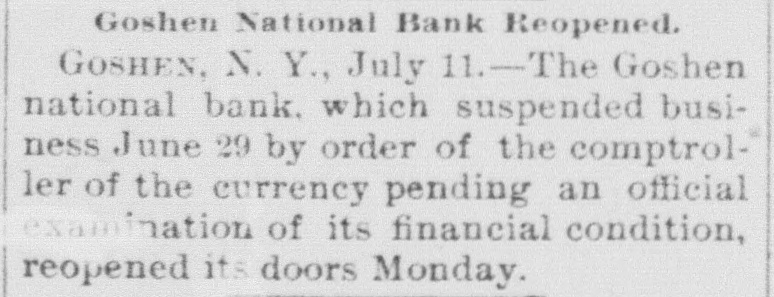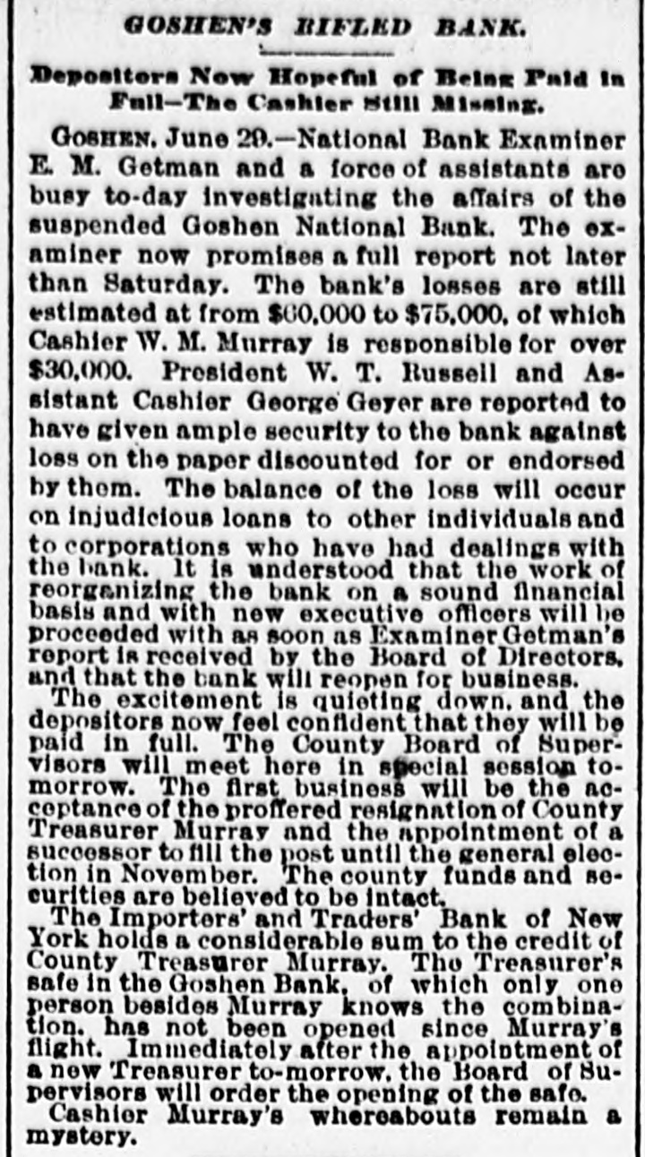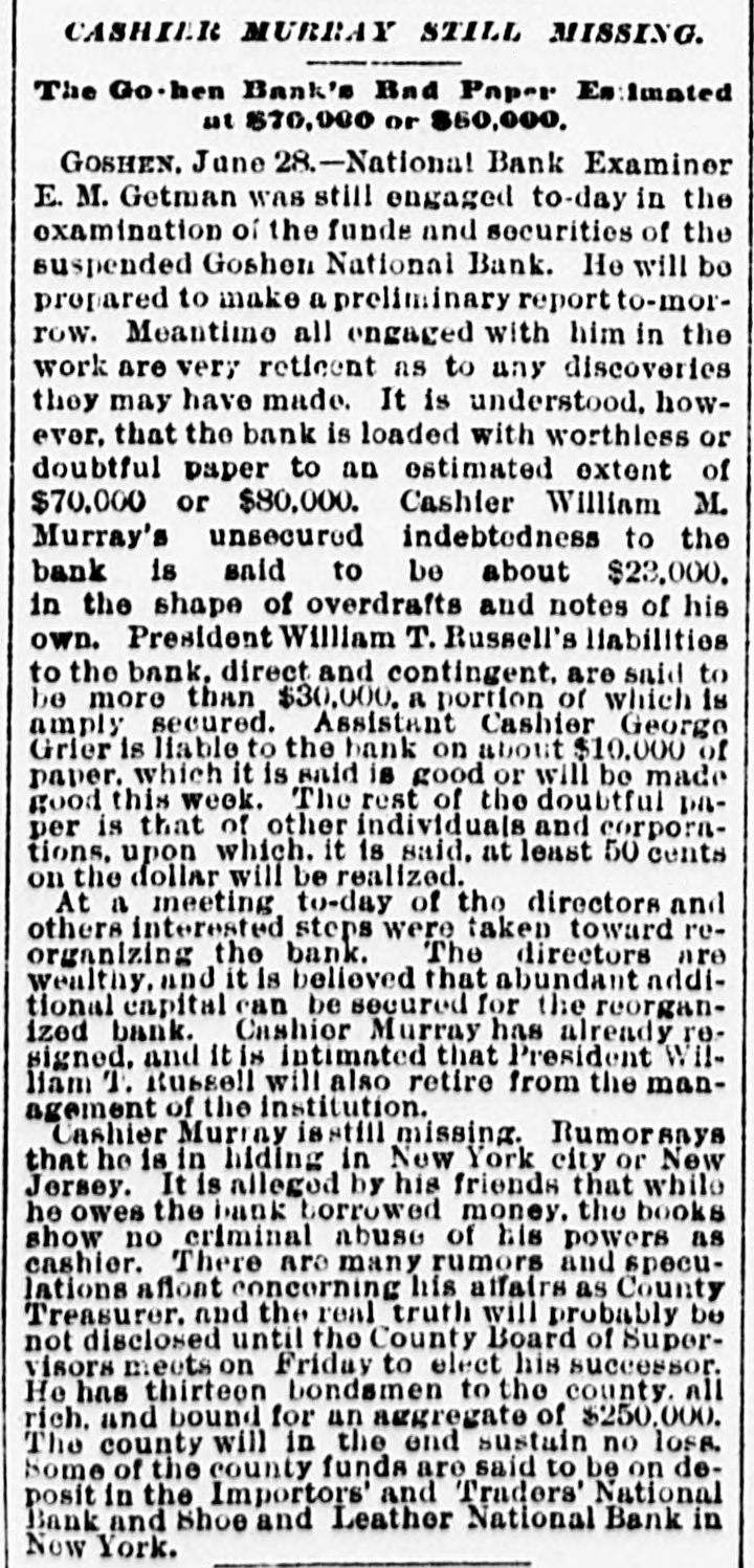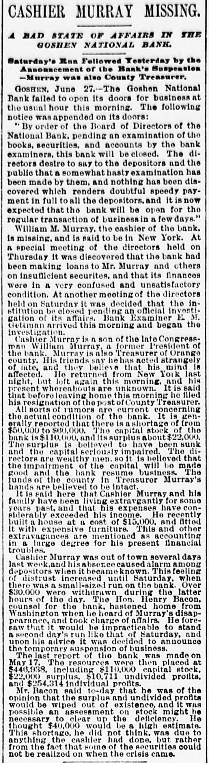 CASHIER MURRAY MISSING. 4 BAD STATE OF AFFAIRS IN THE GOSHEN NATIONAL BANK. Saturday's Run Followed Yesterday by the Announcement of the Bank's Suspension -Murray was also County Treasurer. GOSHEN. June 27.-The Goshen National Bank failed to open its doors for business at the usual hour this morning. The following notice was appended on its doors: By order of the Board of Directors of the National Bank, pending an examination of the books, securities. and accounts by the bank examiners, this bank will be closed. The directors desire to say to the depositors and the public that a somewhat hasty examination has been made by them. and nothing has been discovered which renders doubtful speedy payment in full to all the depositors. and it is now expected that the bank will be open for the regular transaction of business in a few days." William M. Murray. the cashier of the bank. is missing. and is said to be in New York. At a special meeting of the directors held on Thursday it was discovered that the bank had been making loans to Mr. Murray and others on insufficient securites, and that its finances were in a very confused and unsatisfactory condition. At another meeting of the directors held on Saturday it was decided that the institution be closed pending an official investigation of its affairs. Bank Examiner E. M. Gettman arrived this morning and began the investigation. Cashier Murray is n son of the late Congressman William Murray. a former President of the bank. Murray is also Treasurer of Orange county. His friends say he has acted strangely of iate. and they believe that his mind is affected. He returned from New York last night. but left again this morning. and his present whereabouts are unknown. It is said that before leaving home this morning he filed his resignation of the post of County Treasurer. All sorts of rumors are current concerning the actual condition of the bank. It is generally reported that there is a shortage of from $50,000 to $60.000. The capital stock of the bank is $110.000. and its surplus about $22,000. The surplus is believed to have been sunk and the capital seriously impaired. The directors are wealthy men. so it is believed that the impairment of the capital will be made good and the bank resume business. The funds of the county in Trensurer Murray's hands are believed to be intact. It is said here that Cashier Murray and his family have been living extravgantly for some years past, and that his expenses have considerably exceeded his income. He recently built a house at a cost of $15,000. and fitted it with expensive furniture. This and other extravagances are mentioned as accounting in a large degree for his present financial troubles. Cashier Murray was out of town several days last week.and his absence caused alarm among depositors when it became known. This feeling of distrust increased until Saturday. when there was a small-sized run on the bank. Over $30,000 were withdrawn during the latter hours of the day. The Hon. Henry Bacon. counsel for the bank. hastened home from Washington when he heard of Murray's disappearance, and took charge of affairs. He foresaw that it would be impracticable to stand a second day's run like that of Saturday, and upon his advice it was decided to announce the temporary suspension of business. The last report of the bank was made on May 17. The resources were then placed at $446,938. including $110,000 capital stock. $22,000 surplus. $10.711 undivided profits, and $254,314 individual profits. Mr. Bacon said to-day that he was of the opinion that the surplus and undivided profits would be wiped out of existence. and it was possible an assessment on stock might be necessary to clear up the deficiency. He thought $40,000 would be a high estimate. This shortage. he did not think. was due to anything the cashier had done. but rather