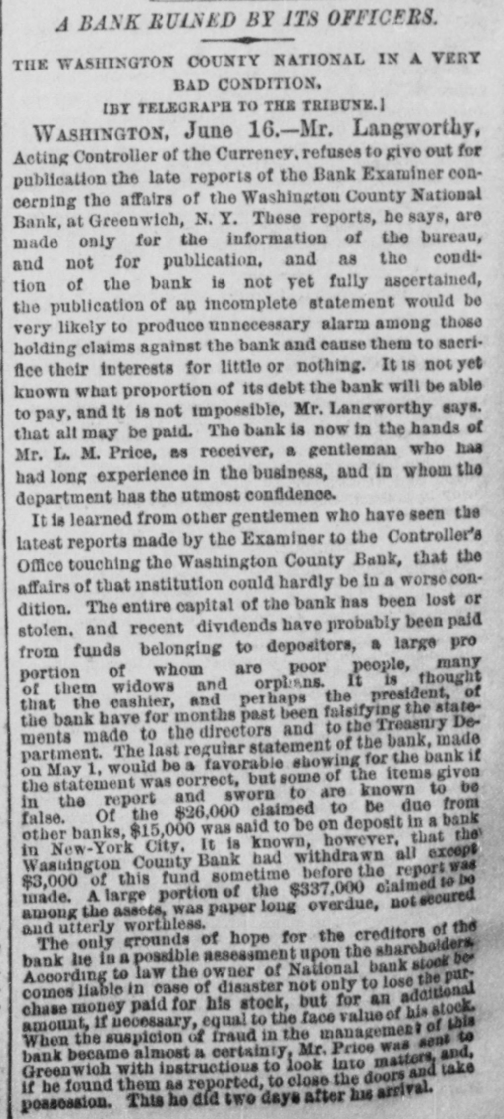 4 BANK RUINED BY ITS OFFICERS. THE WASHINGTON COUNTY NATIONAL IN A VERY BAD CONDITION. IBY TELEGRAPH TO THE TRIBUNE.] WASHINGTON, June 16.-Mr. Langworthy, Acting Controller of the Curreney. refuses to give out for publication the late reports of the Bank Examiner concerning the affairs of the Washington County National Bank, at Greenwich, N. Y. These reports, he says, are made only for the information of the bureau, and not for publication, and as the condition of the bank is not yet fully ascertained, the publication of an incomplete statement would be very likely to produce unnecessary alarm among those holding claims against the bank and cause them to sacrifice their interests for little or nothing. It 18 not yet known what proportion of its debt the bank will be able to pay, and it is not impossible, Mr. Langworthy says. that all may be paid. The bank is now in the hands of Mr. L. M. Price, as receiver, a gentleman who has had long experience in the business, and in whom the department has the utmost confidence. It is learned from other gentlemen who have seen the latest reports made by the Examiner to the Controller's Office touching the Washington County Bank, that the affairs of that institution could hardly be in a worse condition. The entire capital of the bank has been lost or stolen. and recent dividends have probably been paid from funds belonging to depositors, a large pro portion of whom are poor people, many of them widows and orphans. It is thought that the cashier, and perhaps the president, of the bank have for months past been falsifying the statements made to the directors and to the Treasury Department. The last regular statement of the bank, made if May 1, would be a favorable showing for the bank on the statement was correct, but some of the items given in the report and sworn to are known to be false. Of the $26,000 claimed to be due from other banks, $15,000 was said to be on deposit in a bank in New-York City. It is known, however, that the Washington County Bank had withdrawn all except was of this fund sometime before the report be $3,000 A large portion of the $337,000 claimed to among made. the assets, was paper long overdue, not secured and utterly worthless. only grounds of hope for the creditors of the The he in a possible assessment upon the shareholders. be chase amount, bank comes When According money the liable if suspicion necessary, to in paid law case the for of of equal owner his fraud disaster stock, to in of the the not National but face management only for value to lose the pur. bank of his stock of stock this to became almost a certainly, Mr. Price was sent and, bank with instructions to look into matters, take Greenwich he found them as reported, to close the doors and possession. if This he did two days after his arrival.