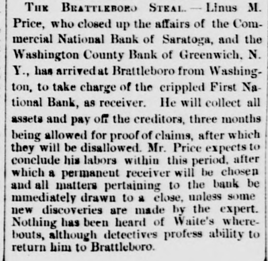 THE BRATTLEBORO STEAL - Linus M. Price, who closed up the affairs of the Commercial National Bank of Saratoga, and the Washington County Bank of Greenwich, N. Y., has arrivedat Brattleboro from Washington, to take charge of the crippled First National Bank, as receiver. He will collect all assets and pay off the creditors, three months being allowed for proof of claims, after which they will be disallowed. Mr. Price expects to conclude his labors within this period, after which a permanent receiver will be chosen and all matters pertaining to the bank be mmediately drawn to a close, unless some new discoveries are made by the expert. Nothing has been heard of Waite's wherebouts, although detectives profess ability to return him to Brattleboro.
