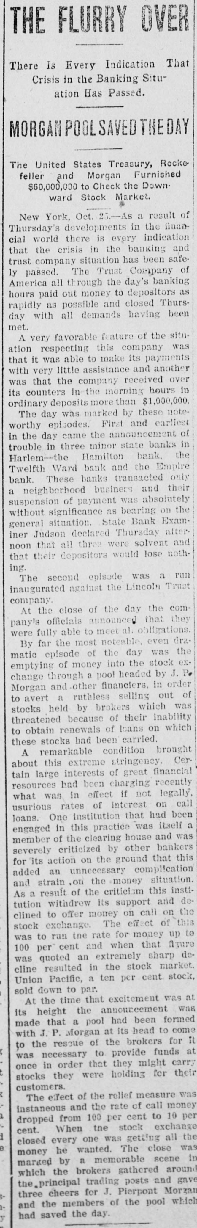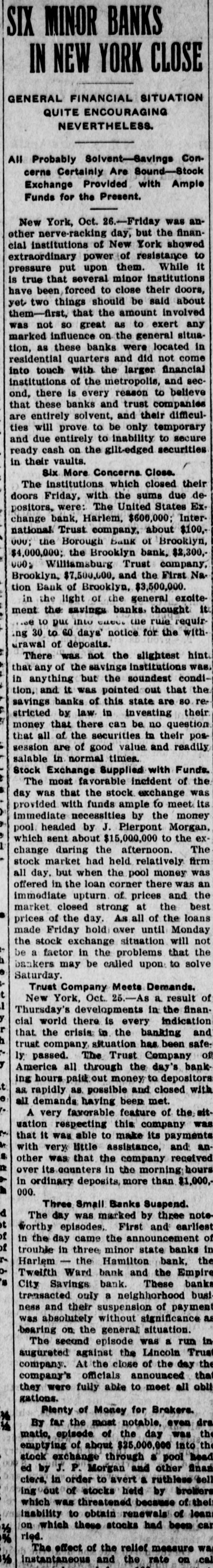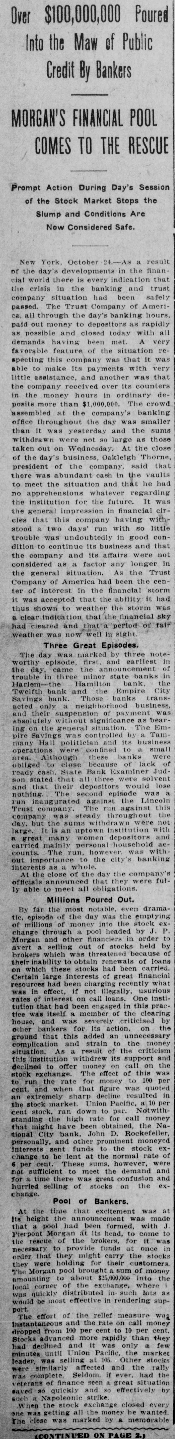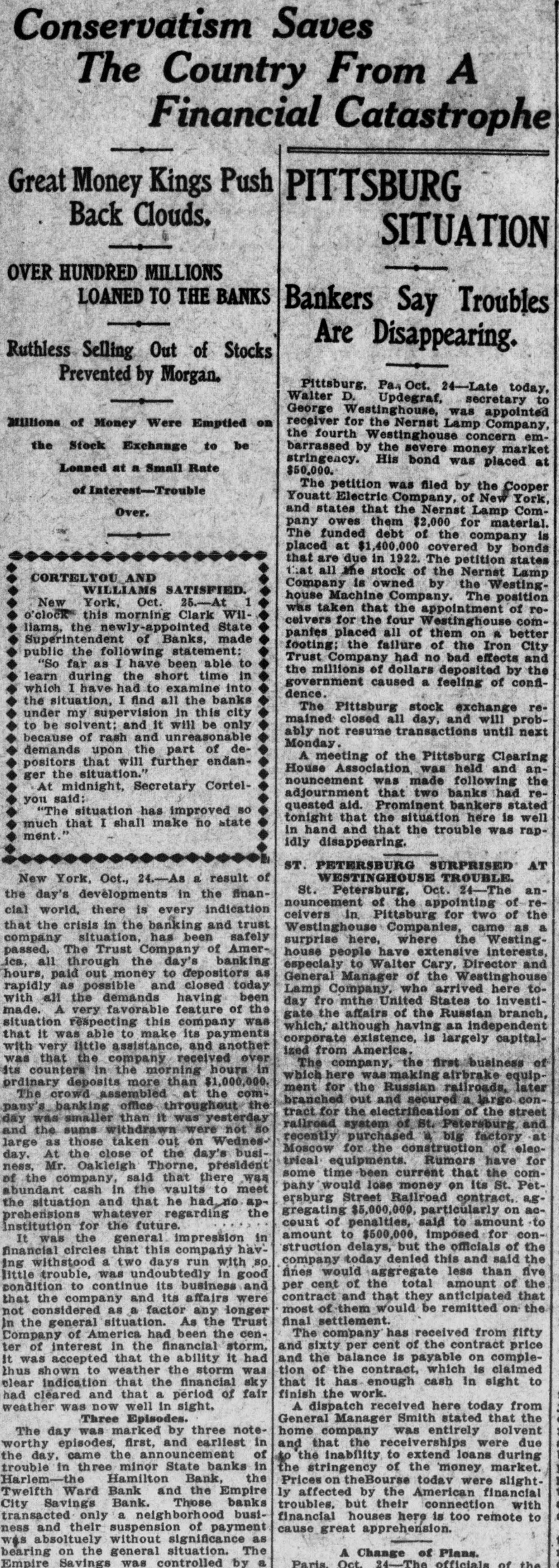 Conservatism Saves The Country From A Financial Catastrophe Great Money Kings Push PITTSBURG Back Clouds. SITUATION OVER HUNDRED MILLIONS LOANED TO THE BANKS Bankers Say Troubles Are Disappearing. Ruthless Selling Out of Stocks Prevented by Morgan. Pittsburg, Pa Oct. 24-Late today, Walter D. Updegraf, secretary to George Westinghouse, was appointed Millions of Money Were Emptied on receiver for the Nernet Lamp Company, the fourth Westinghouse concern emthe Stock Exchange to be barrassed by the severe money market stringency. His bond was placed at Lonned at a Small Rate $50,000. The petition was filed by the Cooper of Interest-Trouble Youatt Electric Company, of New York, and states that the Nernst Lamp ComOver. pany owes them $2,000 for material. The funded debt of the company is placed at $1,400,000 covered by bonds that are due in 1922. The petition states that all the stock of the Nernet Lamp CORTELYOU AND Company is owned by the WestingWILLIAMS SATISFIED. house Machine Company. The position 1 New York, Oct. 25.-At was taken that the appointment of reo'clock this morning Clark Wilceivers for the four Westinghouse comliams, the newly-appointed State panies placed all of them on R better Superintendent of Banks, made footing: the failure of the Iron City public the following statement: Trust Company had no bad effects and "So far as I have been able to the millions of dollars deposited by the learn during the short time in government caused a feeling of confiwhich I have had to examine into dence. the situation, I find all the banks The Pittsburg stock exchange reunder my supervision in this city mained closed all day, and will probto be solvent: and it will be only ably not resume transactions until next because of rash and unreasonable Monday. demands upon the part of deA meeting of the Pittsburg Clearing positors that will further endanHouse Association was held and anger the situation." nouncement was made following the At midnight, Secretary Corteladjournment that two banks had reyou said: quested aid. Prominent bankers stated "The situation has improved so tonight that the situation here is well much that I shall make no state in hand and that the trouble was rapment idly disappearing. ST. PETERSBURG SURPRISED AT WESTINGHOUSE TROUBLE. New York, Oct., 24.-As a result of St. Petersburg, Oct. -The anthe day's developments in the finannouncement of the appointing of reclal world, there is every indication ceivers in Pittsburg for two of the that the crisis in the banking and trust Westinghouse Companies, came as a company situation, has been safely surprise here, where the Westingpassed. The Trust Company of Amerhouse people have extensive interests, ica, all through the day's banking especialy to Walter Cary, Director and hours, paid out money to depositors as General Manager of the Westinghouse rapidly as possible and closed today Lamp Company, who arrived here towith all the demands having been day fro mthe United States to investimade. A very favorable feature of the gate the affairs of the Russian branch, situation respecting this company was which, although having an independent that it was able to make its payments corporate existence, is largely capitalwith very little assistance, and another ized from America. was that the company received over The company, the first business of its counters in the morning hours in which here was making airbrake equipordinary deposits more than $1,000,000. ment for the Russian railroads, later The crowd assembled at the combranched out and secured a largo conpany's banking office throughout the tract for the electrification of the street day was smaller than It was yesterday railroad system of St. Petersburg and and the sums withdrawn were not so recently purchased a big factory at large as those taken out on WednesMoscow for the construction of elecday. At the close of the day's busitrical equipments. Rumors have for ness, Mr. Oakleigh Thorne, president some time been current that the comof the company, said that there was pany would lose money on Its St. Petabundant cash in the vaults to meet ersburg Street Railroad contract, a.g. the situation and that he had no apgregating $5,000,000, particularly on acprehensions whatever regarding the count of penalties, said to amount to Institution for the future. amount to $500,000, imposed for conIt was the general impression in struction delays, but the officials of the financial circles that this company havcompany today denied this and said the Ing withstood a two days run with so fines would aggregate less than five little trouble, was undoubtedly in good per cent of the total amount of the condition to continue its business and contract and that they anticipated that that the company and its affairs were most of them would be remitted on the not considered as a factor any longer final settlement. In the general situation. As the Trust The company has received from fifty Company of America had been the cenand sixty per cent of the contract price ter of interest in the financial storm, and the balance is payable on compleIt was accepted that the ability it had tion of the contract, which is claimed thus shown to weather the storm was that it has enough cash in sight to clear indication that the financial sky finish the work. had cleared and that a period of fair weather was now well in sight. A dispatch received here today from General Manager Smith stated that the Three Episodes. home company was entirely solvent The day was marked by three noteworthy episodes, first, and earliest in and that the receiverships were due the day, came the announcement of to the Inability to extend loans during trouble in three minor State banks in the stringency of the money market. Harlem-the Hamilton Bank, the Prices on theBourse today were slightTwelfth Ward Bank and the Empire ly affected by the American financial City Savings Bank. Those banks troubles, but their connection with transacted only a neighborhoo