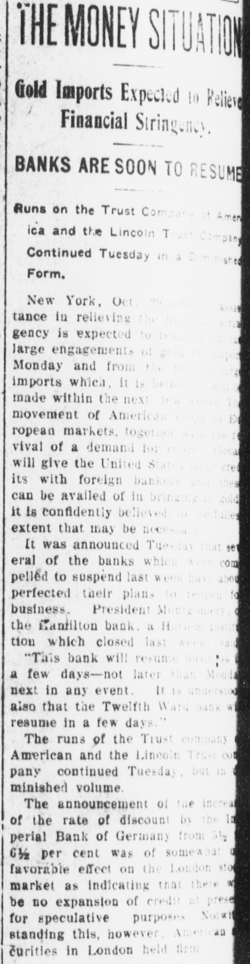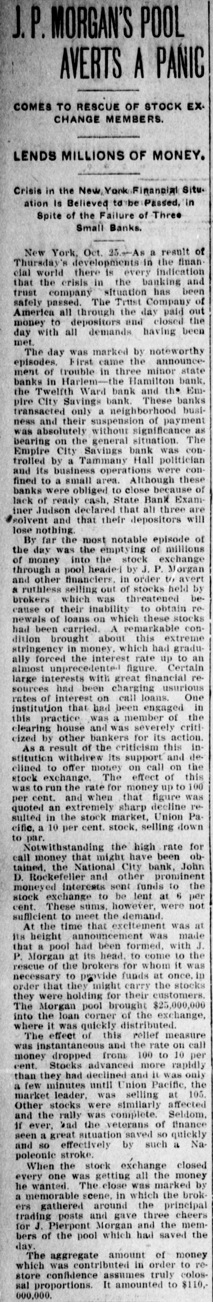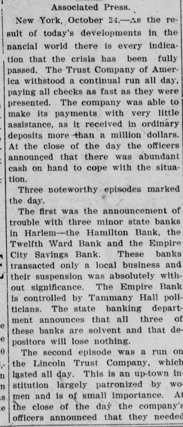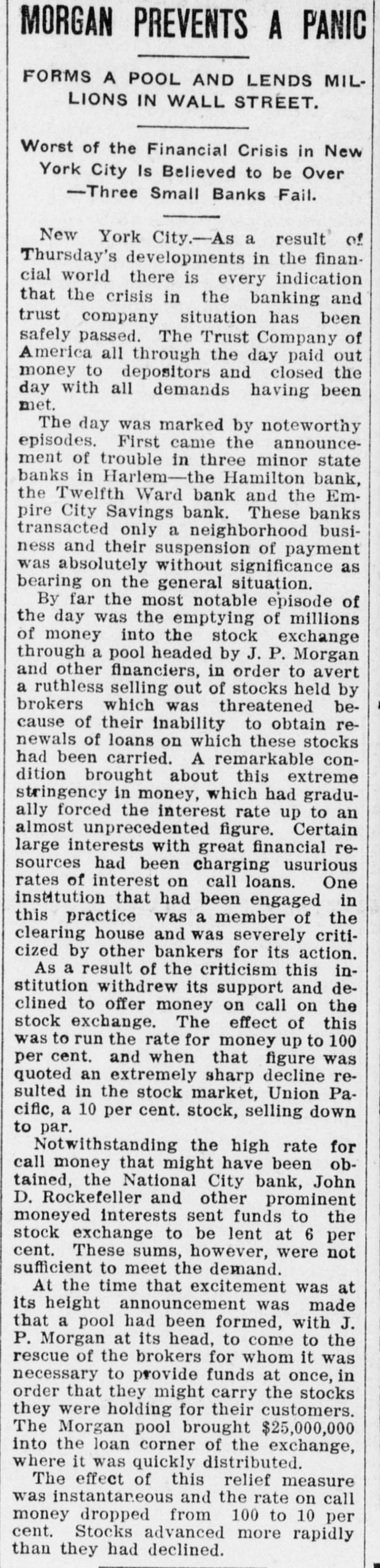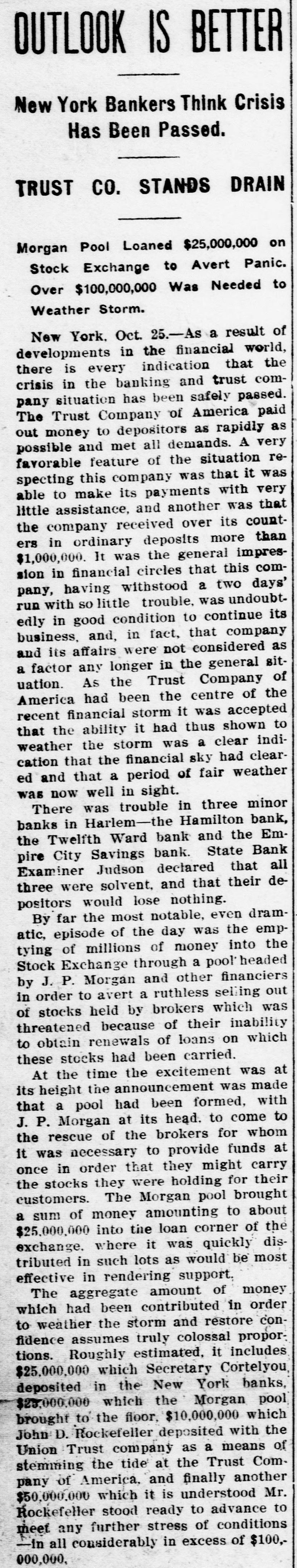 Conservatism Saves The Country From A Financial Catastrophe Great Money Kings Push PITTSBURG Back Clouds. SITUATION OVER HUNDRED MILLIONS LOANED TO THE BANKS Bankers Say Troubles Are Disappearing. Ruthless Selling Out of Stocks Prevented by Morgan. Pittsburg, Pa Oct. 24-Late today, Walter D. Updegraf, secretary to George Westinghouse, was appointed Millions of Money Were Emptied on receiver for the Nernet Lamp Company, the fourth Westinghouse concern emthe Stock Exchange to be barrassed by the severe money market stringency. His bond was placed at Lonned at a Small Rate $50,000. The petition was filed by the Cooper of Interest-Trouble Youatt Electric Company, of New York, and states that the Nernst Lamp ComOver. pany owes them $2,000 for material. The funded debt of the company is placed at $1,400,000 covered by bonds that are due in 1922. The petition states that all the stock of the Nernet Lamp CORTELYOU AND Company is owned by the WestingWILLIAMS SATISFIED. house Machine Company. The position 1 New York, Oct. 25.-At was taken that the appointment of reo'clock this morning Clark Wilceivers for the four Westinghouse comliams, the newly-appointed State panies placed all of them on R better Superintendent of Banks, made footing: the failure of the Iron City public the following statement: Trust Company had no bad effects and "So far as I have been able to the millions of dollars deposited by the learn during the short time in government caused a feeling of confiwhich I have had to examine into dence. the situation, I find all the banks The Pittsburg stock exchange reunder my supervision in this city mained closed all day, and will probto be solvent: and it will be only ably not resume transactions until next because of rash and unreasonable Monday. demands upon the part of deA meeting of the Pittsburg Clearing positors that will further endanHouse Association was held and anger the situation." nouncement was made following the At midnight, Secretary Corteladjournment that two banks had reyou said: quested aid. Prominent bankers stated "The situation has improved so tonight that the situation here is well much that I shall make no state in hand and that the trouble was rapment idly disappearing. ST. PETERSBURG SURPRISED AT WESTINGHOUSE TROUBLE. New York, Oct., 24.-As a result of St. Petersburg, Oct. -The anthe day's developments in the finannouncement of the appointing of reclal world, there is every indication ceivers in Pittsburg for two of the that the crisis in the banking and trust Westinghouse Companies, came as a company situation, has been safely surprise here, where the Westingpassed. The Trust Company of Amerhouse people have extensive interests, ica, all through the day's banking especialy to Walter Cary, Director and hours, paid out money to depositors as General Manager of the Westinghouse rapidly as possible and closed today Lamp Company, who arrived here towith all the demands having been day fro mthe United States to investimade. A very favorable feature of the gate the affairs of the Russian branch, situation respecting this company was which, although having an independent that it was able to make its payments corporate existence, is largely capitalwith very little assistance, and another ized from America. was that the company received over The company, the first business of its counters in the morning hours in which here was making airbrake equipordinary deposits more than $1,000,000. ment for the Russian railroads, later The crowd assembled at the combranched out and secured a largo conpany's banking office throughout the tract for the electrification of the street day was smaller than It was yesterday railroad system of St. Petersburg and and the sums withdrawn were not so recently purchased a big factory at large as those taken out on WednesMoscow for the construction of elecday. At the close of the day's busitrical equipments. Rumors have for ness, Mr. Oakleigh Thorne, president some time been current that the comof the company, said that there was pany would lose money on Its St. Petabundant cash in the vaults to meet ersburg Street Railroad contract, a.g. the situation and that he had no apgregating $5,000,000, particularly on acprehensions whatever regarding the count of penalties, said to amount to Institution for the future. amount to $500,000, imposed for conIt was the general impression in struction delays, but the officials of the financial circles that this company havcompany today denied this and said the Ing withstood a two days run with so fines would aggregate less than five little trouble, was undoubtedly in good per cent of the total amount of the condition to continue its business and contract and that they anticipated that that the company and its affairs were most of them would be remitted on the not considered as a factor any longer final settlement. In the general situation. As the Trust The company has received from fifty Company of America had been the cenand sixty per cent of the contract price ter of interest in the financial storm, and the balance is payable on compleIt was accepted that the ability it had tion of the contract, which is claimed thus shown to weather the storm was that it has enough cash in sight to clear indication that the financial sky finish the work. had cleared and that a period of fair weather was now well in sight. A dispatch received here today from General Manager Smith stated that the Three Episodes. home company was entirely solvent The day was marked by three noteworthy episodes, first, and earliest in and that the receiverships were due the day, came the announcement of to the Inability to extend loans during trouble in three minor State banks in the stringency of the money market. Harlem-the Hamilton Bank, the Prices on theBourse today were slightTwelfth Ward Bank and the Empire ly affected by the American financial City Savings Bank. Those banks troubles, but their connection with transacted only a neighborhoo