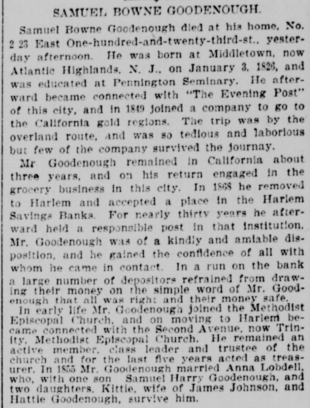 # SAMUEL BOWNE GOODENOUGH. Samuel Bowne Goodenough died at his home, No. 223 East One-hundred-and-twenty-third-st., yesterday afternoon. He was born at Middletown, now Atlantic Highlands, N. J., on January 3, 1826, and was educated at Pennington Seminary. He afterward became connected with "The Evening Post" of this city, and in 1849 joined a company to go to the California gold regions. The trip was by the overland route, and was so tedious and laborious but few of the company survived the journey. Mr Goodenough remained in California about three years, and on his return engaged in the grocery business in this city. In 1868 he removed to Harlem and accepted a place in the Harlem Savings Banks. For nearly thirty years he afterward held a responsible post in that institution. Mr. Goodenough was of a kindly and amiable disposition, and he gained the confidence of all with whom he came in contact. In a run on the bank a large number of depositors refrained from drawing their money on the simple word of Mr. Goodenough that all was right and their money safe. In early life Mr. Goodenough joined the Methodist Episcopal Church, and on moving to Harlem became connected with the Second Avenue, now Trinity, Methodist Episcopal Church. He remained an active member, class leader and trustee of the church and for the last five years acted as treasurer. In 1855 Mr. Goodenough married Anna Lobdell, who, with one son Samuel Harry Goodenough, and two daughters, Kittie, wife of James Johnson, and Hattie Goodenough, survive him.