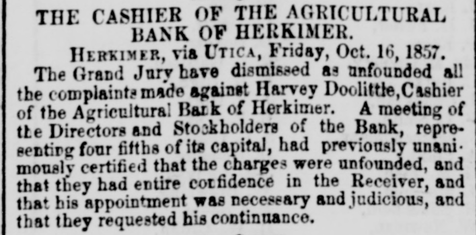 THE CASHIER OF THE AGRICULTURAL BANK OF HERKIMER. HERKIMER, via UTICA, Friday, Oct. 16, 1857. The Grand Jury have dismissed as unfounded all the complaints made against Harvey Doolittle, Cashier of the Agricultural Bank of Herkimer. A meeting of the Directors and Stockholders of the Bank, representing four fifths of its capital, had previously unanimously certified that the charges were unfounded, and that they had entire confidence in the Receiver, and that his appointment was necessary and judicious, and that they requested his continuance.