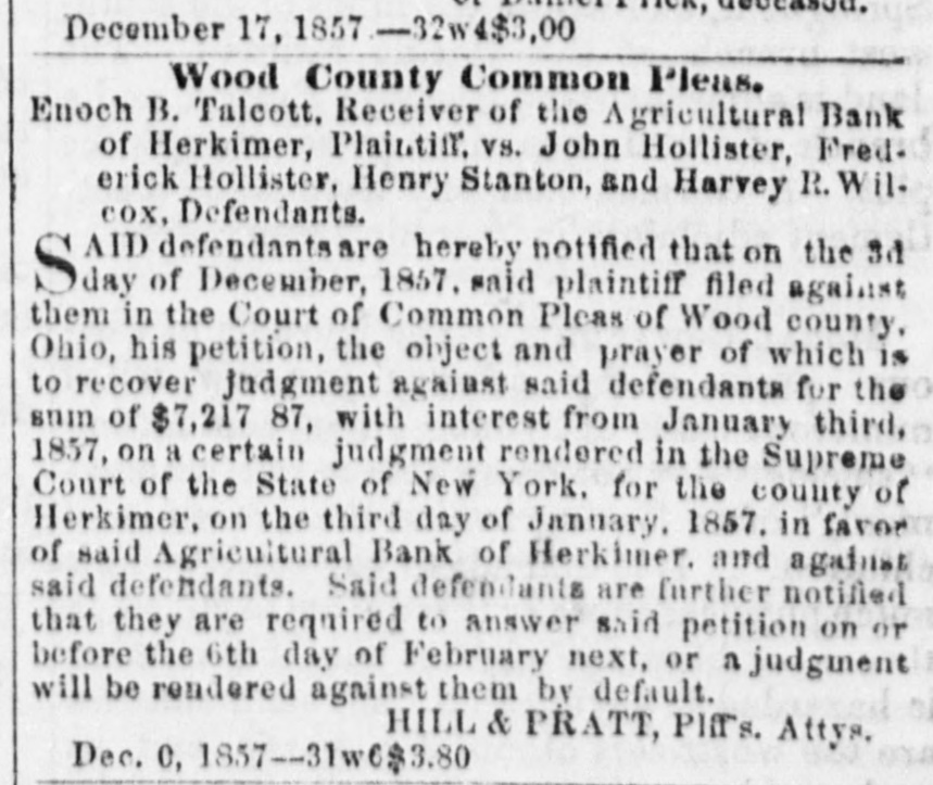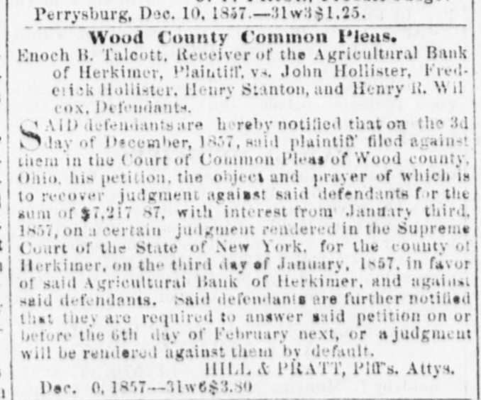 Perrysburg, Dec. 10, 1857.31w3$1.25. Wood County Common Pleas. Enoch B. Talcott. Receiver of the Agricultural Bank of Herkimer, Plaintiff, VS. John Hollister, Frederick Hollister. Henry Stanton, and Henry R. Will cox, Defendants. AID defendantsare hereby notified that on the 3d S day of December, 1857, said plaintiff filed against them in the Court of Common Pleas of Wood county, Ohio, his petition, the object and prayer of which is to recover judgment against said defendants for the sum of $7,217 87, with interest from January third, 1857, on a certain judgment rendered in the Supreme Court of the State of New York. for the county of Herkimer, on the third day of January, 1857. in favor of said Agricultural Bank of Herkimer, and against said defendants. Said defendants are further notified that they are required to answer said petition on or before the 6th day of February next, or a judgment will be rendered against them by default. HILL & PRATT, Pltrs. Attys. Dec. 0, 1857-31w6$3.80