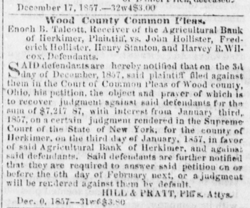 December 17, 1857.32w4$3.00 Wood County Common Pleas. Enoch B. Talcott. Receiver of the Agricultural Bank of Herkimer, Plaintin, VS. John Hollister, Fredcrick Hollister. Henry Stanton, and Harvey R. Wilcox, Defendants. AID defendantsare hereby notified that on the 31 day of December, 1857, said plaintiff filed against them in the Court of Common Pleas of Wood county, Ohio, his petition. the object and prayer of which is to recover judgment against said defendants for the sum of $7,217 87, with interest from January third, 1857, on a certain judgment rendered in the Supreme Court of the State of New York, for the county of Herkimer, on the third day of January, 1857, in favor of said Agricultural Bank of Herkimer, and against said defendants. Said defendants are further notified that they are required to answer said petition on OF before the 6th day of February next, or a judgment will be rendered against them by default. HILL & PRATT, Plffs. Attys. Dec. 0, 1857-31w6$3.80