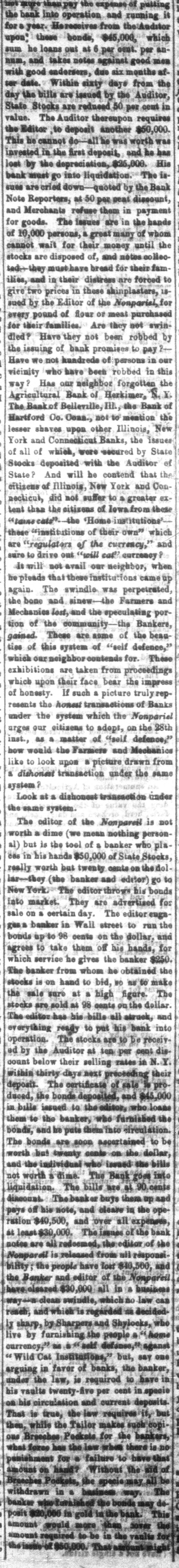 not more than pay the expense of putting the bank into operation and running it for a year. Hereceives from the Auditor upon these honde, $45,000, which sum he loans out at 6 per cent, per annum, and takes notes against good men with good endorsers, duo six months after date. Within sixty days from the day the bills are issued by the Auditor, State Stocks are redueed 50 per cent in value. The Auditor thereupon requires the Editor, to deposit another $50,000. This he cannot do all he was worth was invested in the first deposit, and he has lost by the depreciation, $25,000. His bank must go into liquidation. The is-sues are cried down-quoted by the Bank Note Reporters, at 50 per peat discount, and Merchants refuse them in payment for goods. The issues are in the hands of 10,000 persons, a great many of whom cannot wait for their money until the stocks are disposed of, and notes collec-ted they must have bread for their families, and in their distress are forced to give two prices in these shinplasters, 18-sued by the Editor of the Nonparisl, for every pound of flour or meat purchased for their families. Are they not swin-dled? Have they not been robbed by the issuing of bank promises to pay?-Have we not hundrede of persons in our vicinity who have been robbed in this way? Has our neighbor forgotten the Agricultural Bank of Herkimer, N Y. The Bank of Belleville, Ill., the Bank of Hartford Co. Conn., not to mention the lesser shaves upon other Illinois, New York and Connecticut Banks, the issues of all of which, were secured by State Stocks deposited with the Auditor of State? And will he contend that the citizens of Illinois, New York and Connecticut, did not suffer to a greater ex-tent than the citizens of lowa from these taine cats the Home institutions these institutions of their own" which are "regulators of the currency," and sure to drive out "will cat? currency? It will not avail our neighbor, when he pleads that these institutions came up again. The swindle was perpetrated, the bone and sinew the Farmers and Mechanics lost, and the speculating por-tion of the community the Bankere, gained. These are some of the bean-ties of this system of "self defence," which our neighbor contends for. These exhibitions are taken from proceedings which upon their face bear the impress of honesty. If such a picture truly rep-resents the honest transactions of Banks under the system which the Nonpariel urges our citizens to adopt, on the 28th inst., as a matter of self defence," how would the Farmere and Mechanics like to look upon a picture drawn from a dishonest transaction under the same system ?orien Look at a dishonest transaction under the same system. The editor of the Nonpareil is not worth a dime (we mean nothing person-al) but is the tool of a banker who pla-ces in his hands $50,000 of State Stocks, really worth but twenty cants on the dol-lar-they (the banker and editor) go to New York. The editor throws his bonds Into market. They are advertised for sale on a certain day. The editor enga-gasa banker in Wall street to run the bonds up to 98 cents on the dollar, and agrees to take them off his hands, for which service he gives the banker $250. The banker from whom he obtained the stocks is on hand to bid, so as to make the sale sure at a high figure. The stocks are sold at 98 cents on the dollar. The editor has his bills all struck, and everything ready to put his bank into operation. The stocks are to be receiv ed by the Auditor at ten per cent dis-count below their selling rates in N. Y. within thirty days next preceding their deposit. The certificate of sale is pro-duced, the bonds deposited, and $45,000 in bille issued to the editor, who loans them to the banker, who fúrnished the bonds, and he puts them into sirculation. The bonds are soon ascertained to be worth bus twenty cante on the dollar, and the individual who issued the bills not worth a dime. The Bank goes into liquidation. The bills are at 90 cents discount. The banker buys therm up and pays off his note, and cleare in the ope ration $40,500, and over all expenses, at least $30,000. The issues of the bank notce are all redeemed, the editor of the Nonpareil is released from mil responsi-bility; the people have lost $40,500, and the Banker and editor of the Nonpareil have olesred $30,000 all in a businens way clean swindle, which no law can rench, and which is regarded ne decided-ly sharp, by Sharpers and Shylocks, who live by furnishing the people a home currency, as self defánss, aganst "Wild Cat Institutions," but, say one arguing in favor of banks, the banker, under the law, is required to have in his vaults twenty-five per cent in spesie on his circulation and current deposits. That is true, the law requires it, but then, while the Tailor makes such copi ous Breeches ckets for the bankers, what force has the law when there is no penishment for failure to have that amount on hand? Without the aid of Brosches Pockets, the specie may all be withdrawn in a basinen way. The bankar who furhished the bonds may de posit $20,000 in gold in the bank. This amount smou to be in the vaults for