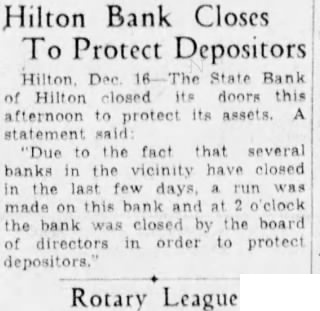 Hilton Bank Closes To Protect Depositors Hilton Dec 16-The State Bank of Hilton closed doors this afternoon to protect its assets. A statement said "Due the fact that several banks in vicinity closed the few run made on this at o'clock the bank closed by the board of directors in order to protect Rotary League