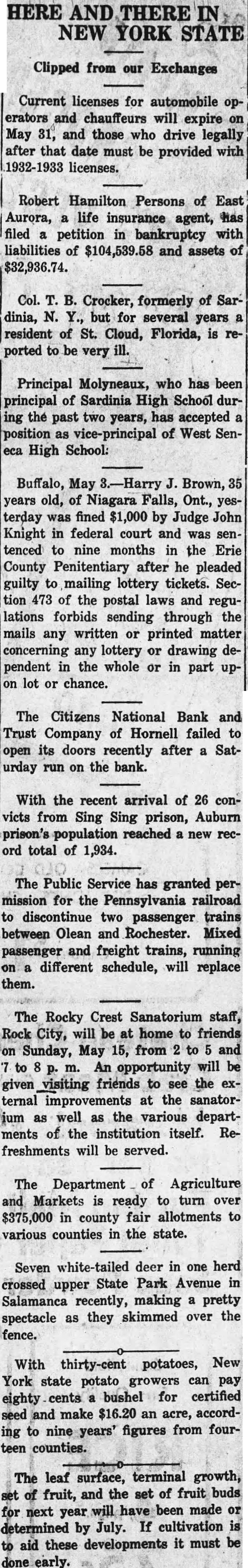 HERE AND THERE IN NEW YORK STATE Clipped from our Exchanges Current licenses for automobile operators and chauffeurs will expire on May 31, and those who drive legally after that date must be provided with 1932-1933 licenses. Robert Hamilton Persons of East Aurora, a life insurance agent, has filed a petition in bankruptcy with liabilities of $104,539.58 and assets of $32,936.74. Col. T. B. Crocker, formerly of Sardinia, N. Y., but for several years a resident of St. Cloud, Florida, is reported to be very ill. Principal Molyneaux, who has been principal of Sardinia High School during the past two years, has accepted a position as vice-principal of West Seneca High School: Buffalo, May 3.-Harry J. Brown, 35 years old, of Niagara Falls, Ont., yesterday was fined $1,000 by Judge John Knight in federal court and was sentenced to nine months in the Erie County Penitentiary after he pleaded guilty to mailing lottery tickets. Section 473 of the postal laws and regulations forbids sending through the mails any written or printed matter concerning any lottery or drawing dependent in the whole or in part upon lot or chance. The Citizens National Bank and Trust Company of Hornell failed to open its doors recently after a Saturday run on the bank. With the recent arrival of 26 convicts from Sing Sing prison, Auburn prison's population reached a new record total of 1,934. The Public Service has granted permission for the Pennsylvania railroad to discontinue two passenger trains between Olean and Rochester. Mixed passenger and freight trains, running on a different schedule, will replace them. The Rocky Crest Sanatorium staff, Rock City, will be at home to friends on Sunday, May 15, from 2 to 5 and 7 to 8 p. m. An opportunity will be given visiting friends to see the external improvements at the sanatorjum as well as the various departments of the institution itself. Refreshments will be served. The Department of Agriculture and Markets is ready to turn over $375,000 in county fair allotments to various counties in the state. Seven white-tailed deer in one herd crossed upper State Park Avenue in Salamanca recently, making a pretty spectacle as they skimmed over the fence. With thirty-cent potatoes, New York state potato growers can pay eighty cents a bushel for certified seed and make $16.20 an acre, according to nine years' figures from fourteen counties. The leaf surface, terminal growth, set of fruit, and the set of fruit buds for next year will have been made or determined by July. If cultivation is to aid these developments it must be done early.
