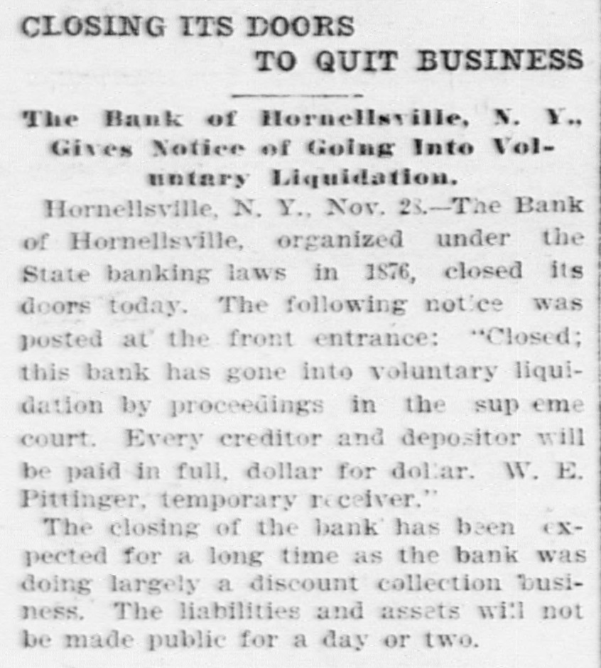 Multiple newspapers report the Bank of Hornellsville closed its doors in late November 1898 and went into voluntary liquidation by proceedings in the state supreme court; a temporary receiver (W. E. Pittinger) was named. No run is reported in the articles. Some sources give Nov 23, 1898 (local notice) and others report Nov 28, 1898; I use the earlier local notice date for the events.