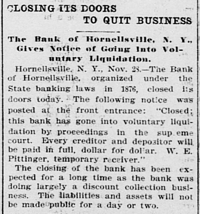 CLOSING ITS DOORS TO QUIT BUSINESS The Bank of Hornellsville, N. Y., Gives Notice of Going Into Voluntary Liquidation. Hornellsville, N. Y., Nov. 28.-The Bank of Hornellsville, organized under the State banking laws in 1876, closed its doors today. The following notice was posted at the front entrance: "Closed: this bank has gone into voluntary liquidation by proceedings in the sup eme court. Every creditor and depositor will be paid in full, dollar for dollar. W. E. Pittinger, temporary receiver." The closing of the bank has been expected for a long time as the bank was doing largely a discount collection business. The liabilities and assets will not be made public for a day or two.