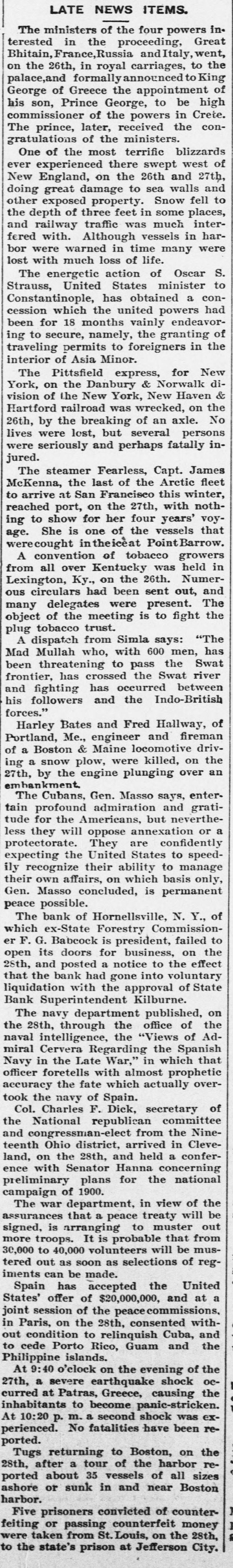 LATE NEWS ITEMS. inministers of the four powers Great The in the proceeding, went, terested France,1 Russia and Italy, to the Bhitain, the 26th, in royal announced carriages, to King on formally of palace,and of Greece the appointment be high George Prince George, to in Crete. his commissioner son, of the powers the conprince, later, received gratulations The of the ministers. blizzards of the most terrific west of One experienced there swept and 27th, ever England, on the 26th walls and New great damage to sea Snow fell to doing exposed property: places, other of three feet in some interthe depth railway traffic was much in harand with. Although vessels were fered were warned in time many lost bor with much loss of life. S. energetic action of minister Oscar to The United States conConstantinople, Strauss, has obtained a had which the united powers endeavorcession for 18 months vainly of been secure, namely, the granting in the ing traveling to permits to foreigners interior of Asia Minor. New Pittsfield express, for diThe on the Danbury & Norwalk Haven & York, of the New York, New the Hartford vision railroad was wrecked, on No by the breaking of an axle. persons 26th, were lost, but several inlives were seriously and perhaps fatally jured. steamer Fearless, Capt. James fleet The the last of the Arctic winter, McKenna, at San Francisco this nothto reached arrive port, on the 27th, with voyto show for her four years' that ing She is one of the vessels age. werecought intheiceat PointBarrow. convention of tobacco growers held in A all over Kentucky was NumerLexington, from Ky., on the 26th. out, and circulars had been sent The ous delegates were present. the object many of the meeting is to fight plug tobacco trust. dispatch from Simla says: "The has A Mullah who, with 600 men, Swat Mad threatening to pass the river been has crossed the Swat between frontier, fighting has occurred and his followers and the Indo-British forces." Harley Bates and Fred Hallway, fireman of Portland, Me., engineer and drivBoston & Maine locomotive the of a snow plow, were killed, on an 27th, ing a by the engine plunging over emhankment. The Cubans, Gen. Masso says, enter- gratiprofound admiration and neverthetude tain for the Americans, but or a less they will oppose annexation protectorate. They are confidently expecting the United States to speedrecognize their ability to manage ily their own affairs, on which basis only, Gen. Masso concluded, is permanent peace possible. The bank of Hornellsville, N. Y., of which ex-State Forestry CommissionF. G. Babcock is president, failed the to er its doors for business, on effect 28th, open and posted a notice to the that the bank had gone into voluntary liquidation with the approval of State Bank Superintendent Kilburne. The navy department published, the on the 28th, through the office of naval intelligence, the "Views of Admiral Cervera Regarding the Spanish that Navy in the Late War," in which officer foretells with almost prophetic accuracy the fate which actually overtook the navy of Spain. Charles F. Dick, secretary of National republican the Col. committee the Nineand congressman-elect from teenth Ohio district, arrived in Cleveland, on the 28th, and held a conference with Senator Hanna concerning preliminary plans for the national campaign of 1900. The war department, in view of the be assurances that a peace treaty will signed, is arranging to muster out more troops. It is probable that from 30,000 to 40,000 volunteers will be mustered out as soon as selections of regiments can be made. Spain has accepted the United a States' offer of $20,000,000, and at joint session of the peace commissions. in Paris, on the 28th, consented without condition to relinquish Cuba, and to cede Porto Rico, Guam and the Philippine islands. At 9:40 o'clock on the evening of the 27th, a severe earthquake shock occurred at Patras, Greece, causing the to become panic-stricken. m. a second was exinhabitants At 10:20 p. shock perienced. No fatalities have been reported. Tugs returning to Boston, on the 28th, after a tour of the harbor reported about 35 vessels of all sizes ashore or sunk in and near Boston harbor. J Five prisoners convicted of counter1 feiting or passing counterfeit money & were taken from St. Louis, on the 28th, to the state's prison at Jefferson City.