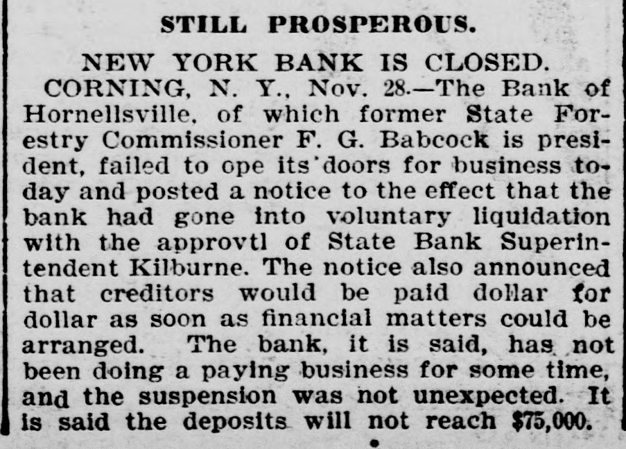 STILL PROSPEROUS. NEW YORK BANK IS CLOSED. CORNING, N. Y., Nov. 8.-The Bank of Hornellsville, of which former State Forestry Commissioner F. G. Babcock is president, failed to ope its' doors for business today and posted a notice to the effect that the bank had gone into voluntary liquidation with the approvtl of State Bank Superintendent Kilburne. The notice also announced that creditors would be paid dollar for dollar as soon as financial matters could be arranged. The bank, it is said, has not been doing a paying business for some time, and the suspension was not unexpected. It is said the deposits will not reach $75,000.