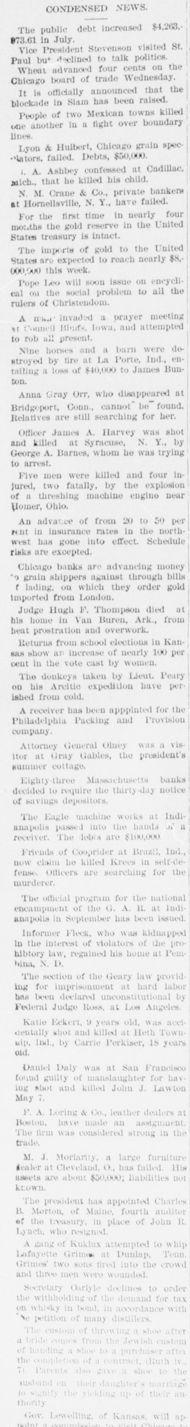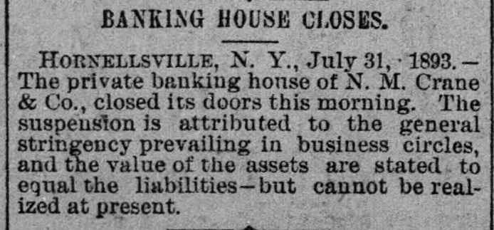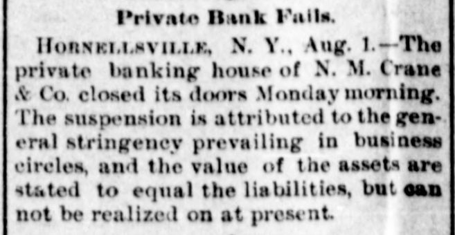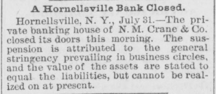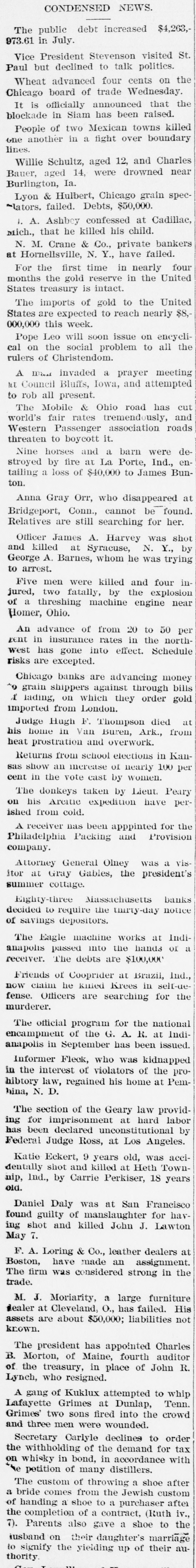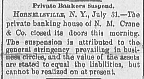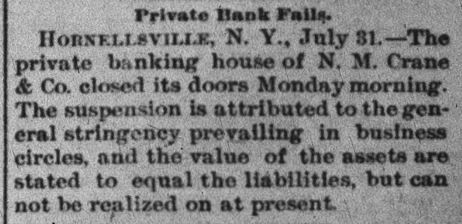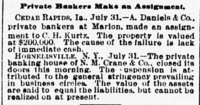BANKS STILL CRASHING. MORE FAILURES REPORTED FROM THE WEST. FOUR SUSPENSIONS IN OREGON AND OTHERS IN OHIO, WISCONSIN, IOWA AND MISSOURI. Upper Sandusky, Ohio, July 31.--The Wyandotte County Bank went into the hands of a receiver this morning. The bank officials say that the assets are sufficient to pay depositors three times over. Heavy runs last week among farmers caused the suspension. John B. Layton and Dr. R. N. McConnell were ap pointed as receivers. Akron, Ohio, July 31.-The Akron Savings Bank did not open this morning for business. William Buchtel, president of the bank, has been appointed requiver. The capital stock is $200,000, with a reserve fund of $50,000, and undivided profits of $18,000. The bank will pay dollar for dollar. Hornellsville, N. Y., July 31.-The private banking house of N. M. Crane & Co. closed its doors this morning. The value of the assets is stated to equal the liabilities. Milwaukee, July 31.-A dispatch from Ashland, Wis., says: The First National Bank of Ashland failed to open its doors this morning. There has been a steady draw on the bank's deposit for a month. Its resources, according to the statement filed July 15, were $306,488. Dr. Edwin Ellis is president, and exGovernor Samuel S. Fifield, vice-president. The other banks are experiencing runs In consequence of the First National's failure. Cedar Rapids, Iowa, July 31.-A. Daniels & Cb., private bankers at Marion, made an assignment to C. H. Kurtz. The property is valued at $200,000. Springfield, Mo., July 31.-The Springfield Savings Bank, with a capital of $25,000 and deposits of about $100,000, made an assignment this morning. The bank is solvent and will pay in full. Portland, Ore., July 31.-The First National Bank of East Portland failed to open its doors this morning. The officers of the bank say the suspension is temporary. A statement published on July 12 shows the resources of the bank to be $325,000; deposits, $150,000. The Commercial Bank of Cottage Grove failed this morning. The Dalles, Ore., July 31.-The First National Bank closed its doors this morning. The suspension is due to the closing of the Commercial National Bank, of Portland. Pendleton, Ore., July 31.-The Pendleton Savings Bank has temporarily suspended. R. T. Cox has been appointed receiver. Assets, $250,000; liabilities, $135,000. Helena, Mont., July 31.-The Park National Bank. of Livingston, closed this morning. No statement is given. Indianapolis, July 31 (Special).-The investigation of the condition of the suspended Indianapolis National bank by Hugh Young, special examiner. is developing a bad state of affairs. It was reported to-day that President Hanghey was a borrower from the bank in excess of the 10 per cent of the capital stock allowed by law, and that factories in which officers of the bank are interested nad secured sums on loans in excess of the amount allowed by law. Mr. Hanghey saw representatives of the newspapers to-day for the first time since the bank suspendel, and he denies that he has violated the National banking laws.