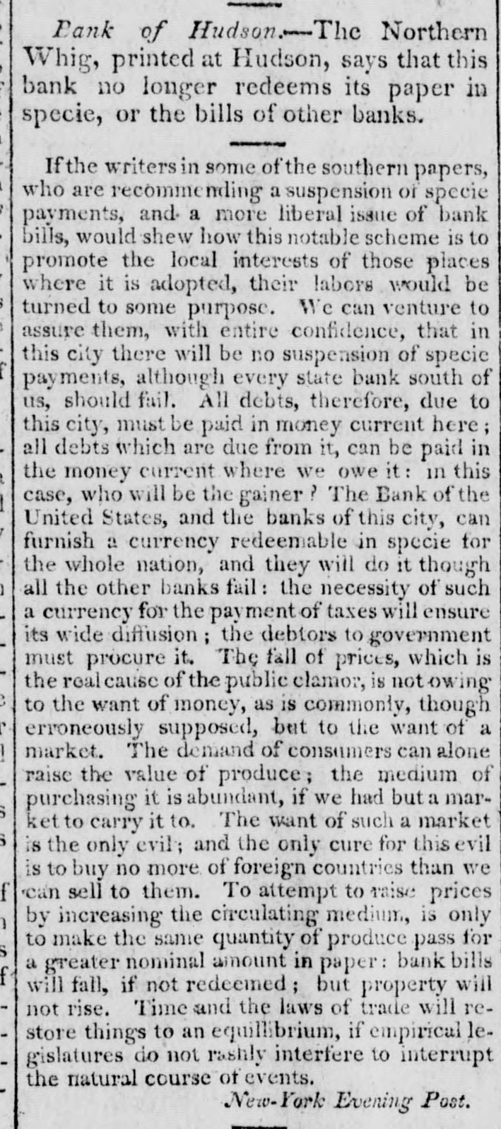 Bank of Hudson. - The Northern Whig, printed at Hudson, says that this bank no longer redeems its paper in specie, or the bills of other banks. If the writers in some of the southern papers, who are recommending a suspension of specie payments, and a more liberal issue of bank bills, would shew how this notable scheme is to promote the local interests of those places where it is adopted, their labors would be turned to some purpose. We can venture to assure them, with entire confidence, that in this city there will be no suspension of specie payments, although every state bank south of us, should fail. All debts, therefore, due to this city, must be paid in money current here; all debts which are due from it, can be paid in the money current where we owe it: in this case, who will be the gainer? The Bank of the United States, and the banks of this city, can furnish a currency redeemable in specie for the whole nation, and they will do it though all the other banks fail: the necessity of such a currency for the payment of taxes will ensure its wide diffusion; the debtors to government must procure it. The fall of prices, which is the real cause of the public clamor, is not owing to the want of money, as is commonly, though erroneously supposed, but to the want of a market. The demand of consumers can alone raise the value of produce; the medium of purchasing it is abundant, if we had but a market to carry it to. The want of such a market is the only evil; and the only cure for this evil is to buy no more of foreign countries than we can sell to them. To attempt to raise prices by increasing the circulating medium, is only to make the same quantity of produce pass for a greater nominal amount in paper: bank bills will fall, if not redeemed; but property will not rise. Time and the laws of trade will restore things to an equilibrium, if empirical legislatures do not rashly interfere to interrupt the natural course of events. New-York Evening Post.