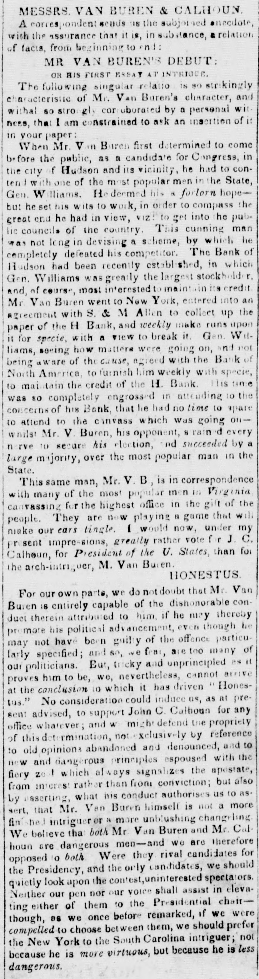 MESSRS. VAN BUREN & CALHOUN. A correspondent sends us the subjoined anecdote, with the assurance that it is, in substance, a relation of facts, from beginning to end: MR VAN BUREN'S DEBUT: OR HIS FIRST ESSAY AT INTRIGEE. The following singular relatio is so strikingly characteristic of Mr. Van Buren's character, and withal so strongly corroborated by a personal witness, that I am constrained to ask an insertion of it in your paper: When Mr. Van Buren first determined to come before the public, as a candidate for Congress, in the city of Hudson and its vicinity, he had to contend with one of the most popular men in the State, Gen. Williams. Hedeemed his a forlorn hope-but he set his wits to work, in order to compass the great end he had in view, viz: to get into the public councils of the country. This cunning man was not long in devising a scheme, by which he completely defeated his competitor. The Bank of Hudson had been recently established, in which Gen. Williams was greatly the largest stockholder, and, of course, most interested to maintain its credit. Mr. Van Buren went to New York, entered into an agreement with S. & M Allen to collect up the paper of the H Bank, and weekly make runs upon it for specie, with a view to break it. Gen. Williams, seeing how matters were going on, and not being aware of the cause, agreed with the Bank of North America, to furnish him weekly with specie, to maintain the credit of the H. Bank. His time was so completely engrossed in attending to the concerns of his Bank, that he had no time to spare to attend to the canvass which was going on-whilst Mr. V. Buren, his opponent, s rained every nerve to secure his election, and succeeded by a large majority, over the most popular man in the State. This same man, Mr. V. B., is in correspondence with many of the most popular men in Virginia canvassing for the highest office in the gift of the people. They are now playing a game that will niake our ears tingle. I would now, under my present impressions, greally rather vote for J. C. Calhoun, for President of the U. States, than for the arch-intriguer, M. Van Buren. HONESTUS. For our own parts, we do not doubt that Mr. Van Buren is entirely capable of the dishonorable conduct therein attributed to him, if he may thereby promote his political advancement, even though he may not have been guilty of the offence particularly specified; and so, we fear, are too many of our politicians. But, tricky and unprincipled as it proves him to be, we, nevertheless, cannot arrive at the conclusion to which it has driven "Honestus." No consideration could induce us, as at present advised, to support John C. Calhoun for any office whatever; and we might defend the propriety of this determination, not exclusively by reference to old opinions abandoned and denounced, and to new and dangerous principles espoused with the fiery ze! which always signalizes the apostate, from interest rather than front conviction; but also by asserting, what his conduct authorises us to assert, that Mr. Van Buren himself is not a more finished intriguer or a more unblushing changeling. We believe that both Mr. Van Buren and Mr. Calhoun are dangerous men-and we are therefore opposed to both. Were they rival candidates for the Presidency, and the orly candidates, we should quietly look apon the contest, uninterested spectators. Neither our pen nor our voice shall assist in elevating either of them to the Presidential chait-though, as we once before remarked, if we were compelled to choose between them, we should prefer the New York to the South Carolina intriguer; not because he is more virtuous, but because he is less dangerous.