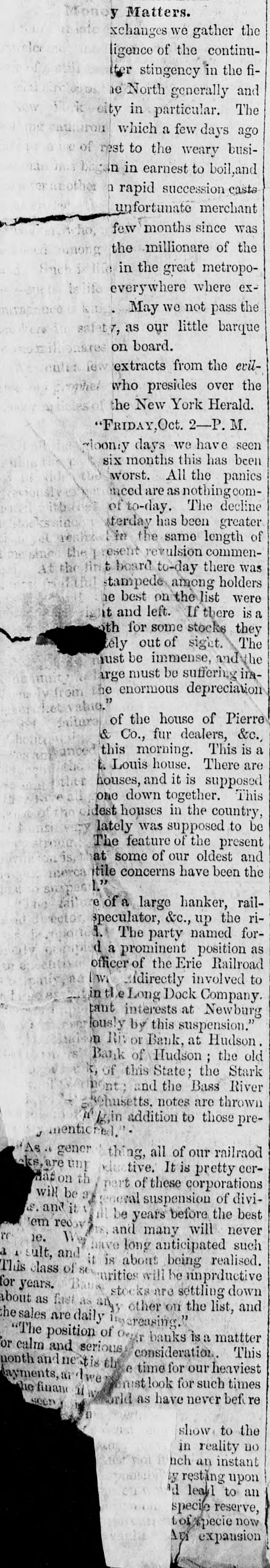 xchanges we gather the ligence of the continulter stingency in the fie North generally and city in particular. The which a few days ago rest to the weary busin in earnest to boil,and a rapid succession casts unfortunate merchant few months since was the millionare of the in the great metropoeverywhere where exMay we not pass the T, as our little barque on board. extracts from the evilwho presides over the the New York Herald. "FRIDAY, Oct. 2-P. M. moony days we have seen six months this has been worst. All the panics inced are as nothingcomof to-day. The decline terday has been greater in the same length of esent revulsion comment board to-day there was stampede among holders he best on the list were it and left. If there is a th for some stocks they tely out of sight. The just be immense, and the arge must be suffering imhe enormous depreciation " of the house of Pierre & Co., fur dealers, &c., this morning. This is a t. Louis house. There are houses, and it is supposed one down together. This lest houses in the country, lately was supposed to be The feature of the present at some of our oldest and tile concerns have been the e of a large hanker, railspeculator, &c., up the ri1. The party named ford a prominent position as officer of the Erie Railroad We idirectly involved to in tl Long Dock Company. tant interests at Newburg lously by this suspension.' n RR: or Bank, at Hudson. Bank of Hudson ; the old C, of this State; the Stark and the Bass River Whusetts. notes are thrown W kin addition to those prementioned. As gener thing, all of our railraod cks are unr tive. It is pretty ceron th part of these corporations will be general suspension of divioj and it be years before the best tem reo and many will never ie. 1 and have long anticipated such sult, it is about being realised. his class St of arities will be inprductive years. are settling down out as fast as other on the list, and esales are daily creasing. "The position of Over banks is a mattter calm and serious consideration. This onth and ne is the e time for our heaviest wments, he financ 11 lwe rust look for such times world as have never beft re seen show to the in reality no nch.an instant