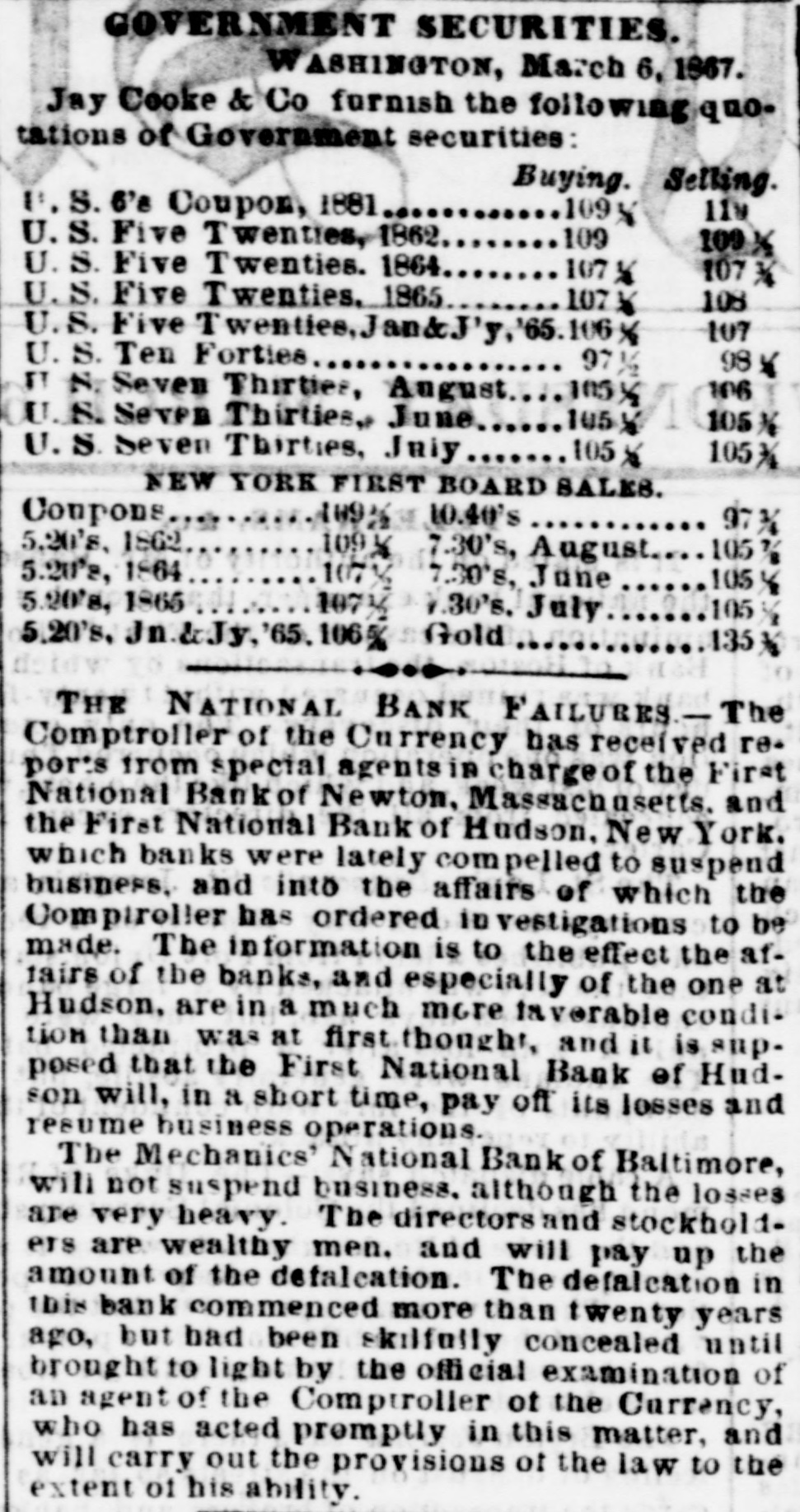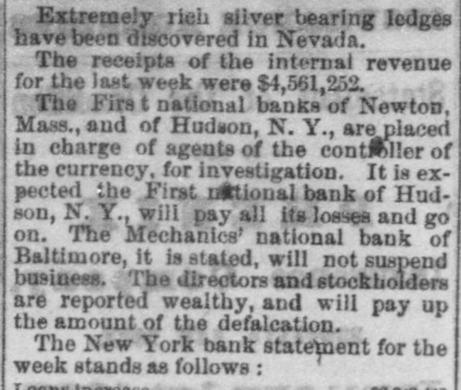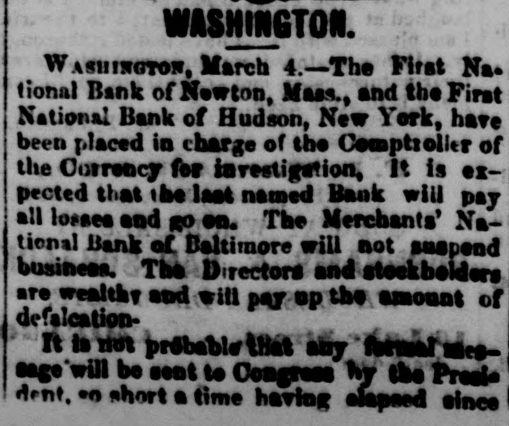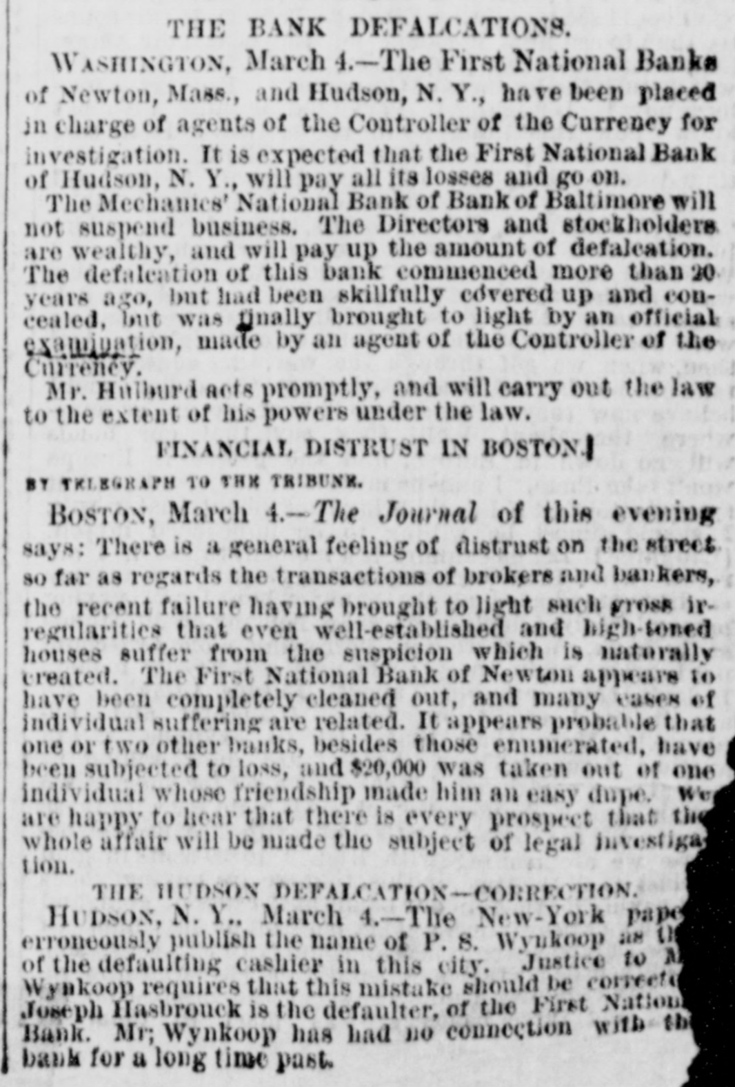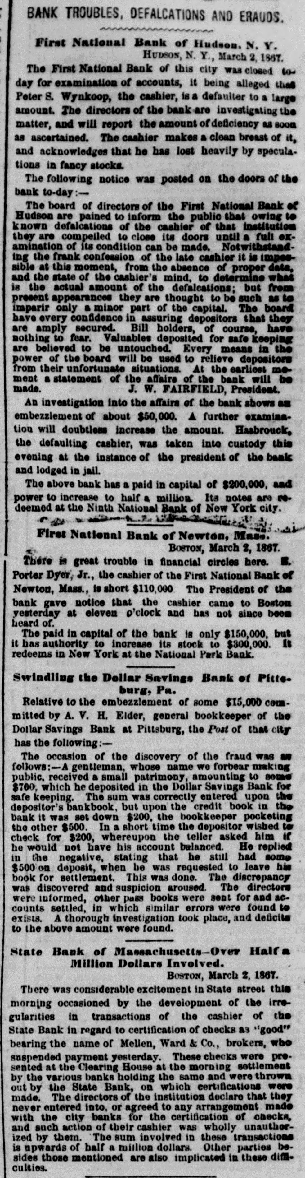 BANK TROUBLES, DEFALCATIONS AND ERAUDS. First National Bank of Hudson. N. Y. HUDSON, N. Y., March 2, 1867. The First National Bank of this city was closed to day for examination of accounts, it being alleged that Peter S. Wynkoop, the cashier, is a defaulter to a large amount. The directors of the bank are investigating the matter, and will report the amount of deficiency as soon as ascertained. The cashier makes a clean breast of it, and acknowledges that he has lost heavily by speculations in fancy stocks. The following notice was posted on the doors of the bank to-day:The board of directors of the First National Bank of Hudson are pained to inform the public that owing to known defalcations of the cashier of that institution they are compelled to close its doors until a full examination of its condition can be made. Notwithstand. ing the frank confession of the late cashier it is impossible at this moment, from the absence of proper data, and the state of the cashier's mind, to determine what is the actual amount of the defalcations; but from present appearances they are thought to be such as to imparir only a minor part of the capital. The board have every confidence in assuring depositors that they are amply secured. Bill holders, of course, have nothing to fear. Valuables deposited for safe keeping are believed to be untouched. Every means in the power of the board will be used to relieve depositors from their unfortunate situations. At the earliest mement a statement of the affairs of the bank will be made. J. W. FAIRFIELD, President. An investigation into the affairs of the bank shows as embezzlement of about $50,000. A further examina. tion will doubtless increase the amount. Hasbrouck, the defaulting cashier, was taken into custody this evening at the instance of the president of the bank and lodged in jail. The above bank has a paid in capital of $200,000, and power to increase to half a million. Its notes are no. deemed at the Ninth National Bank of New York city. First National Bank of Newton, Mass. BOSTON, March 2, 1867. There is great trouble in financial circles here. E. Porter Dyer, Jr., the cashier of the First National Bank of Newton, Mass., is short $110,000 The President of the bank gave notice that the cashier came to Boston yesterday at eleven o'clock and has not since been heard of. The paid in capital of the bank is only $150,000, but it has authority to increase its stock to $300,000. It redeems in New York at the National Park Bank. Swindling the Dollar Savings Bank of Pitte. burg, Pa. Relative to the embezzlement of some $15,000 CODEmitted by A. V. H. Elder, general bookkeeper of the Dollar Savings Bank at Pittsburg, the Post of that city has the following:The occasion of the discovery of the fraud was as follows:-A gentleman, whose name we forbear making public, received a small patrimony, amounting to some $700, which he deposited in the Dollar Savings Bank for safe keeping. The sum was correctly entered upon the depositor's bankbook, but upon the credit book in the bank it was set down $200, the bookkeeper pocketing the other $500. In a short time the depositor wished to check for $200, whereupon the teller asked him if he would not have his account balanced. He replied in the negative, stating that he still had some $500 on deposit, when be was requested to leave his book for settlement. This was done. The discrepancy was discovered and suspicion aroused. The directors were informed, other pass books were sent for and accounts settled, in which similar errors were found to exists. A thorough investigation took place, and deficits to the above amount were found. State Bank of Massachusetts-Over Half a Million Dollars Involved. BOSTON, March 2, 1867. There was considerable excitement in State street this morning occasioned by the development of the irregularities in transactions of the cashier of the State Bank in regard to certification of checks as "good" bearing the name of Mellen, Ward & Co., brokers, who suspended payment yesterday. These checks were presented at the Clearing House at the morning settlement by the various banks holding the same and were thrown out by the State Bank, on which certifications were made. The directors of the institution declare that they never entered into, or agreed to any arrangement made with the city banks for the certification of checks, and such action of their cashier was wholly unauthorized by them. The sum involved in these transactions is upwards of half a million dollars. Other parties besides those mentioned are also implicated in these diffculties.