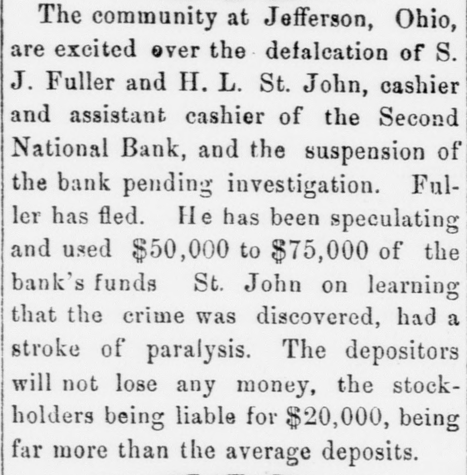 LAST NIGHT'S NEWS IN BRIEF. There were two slight earthquakes at Panama on Tuesday. 20 counterfeit plates, captured by Service Secret in the of being for a corn and William at stroyed "short" The Over Randall, Chicago, oats. Bell failed considerable Treasury C. agents, & yesterday Moore Co., have Department. commission Banking amount morning, just House been in dealers deVictor, New York, suspended yesterday, in consequence of the City Bank failure at Rochester. The farm buildings of E. C. Hawkes, at Charlemont, Mass., were burned yesterday with 150 sheep, 50 calves and a quantity of hay and grain. Daniel and Thomas League were arrested yesterday in Mobile, while passing counterfeit quarter dollars, and implements were found in their possession. The Copeland Hotel, and a block adjoining, in Pembroke, Canada, were burned Three yesterday morning. Loss, $10,000. lives were lost in the hotel. The schedule in the assignment of Graham & Altken, dry goods merchants of New York, shows liabilities amounting to $169. 849, and actual assets amounting to $128,914. The hospital of the Sisters of Charity at Big Rapids, Micbigan, was burned yester day, and a valuable library, belonging to the estate of the late Father de Conick, Was destroyed. An incendiary fire at Morristown N. J., yesterday morning, destroyed a large barn and outbuilding belonging to Senator Randolph, also a new steam ditcher, lately patented by him and built at an expense of over $6,000. The trouble at Opelika, Alabama, continues. The house of B. H. Heiser, editor of the Times, was fired into on Tuesday night. Ten buckshot crashed through his bedroom window and buried themselves in the opposite wall. General N. M. Curtis, convicted in New York of violation of the Anti-political Assessment law and sentenced to pay a fine of $1,000, yesterday, handed over a check for the amount, in open court, and was diecharged from custody. A telegram from Concord, N. H., says that "one of the largest and most brilliant meteors ever observed" there was seen yesterday afternoon. between 4 and 5 o'clock. It passed from west to east, and "was as plainly visible as meteors usually are after dark." The frame shop of Frazer & Jones, contractors, in the yard of the County Prison at Syracuse, New York, was burned yesterday morning, and Henry W. Austin, watchman, was burned to death. The loss on property is estimated at about $40,000. Charles A. Dunning, a well-known citizen of Denton, Md., was found dead in his carriage near his house yesterday morning, with his head badly cut and bruised, hanging between the front wheel and the shafts. A coroner's jury found that his death resulted from an attack of vertigo. An attempt was made on Tuesday night to burn the town of Henderson, North Carolina. Three stores were fired, one of them in four places, coal oil being used freely. A vigilance committee of fifty has been formed to patrol the town at night. A few years ago the town was almost entirely destroyed by incendiary fires. The jury in the case of Solomon Jones, on trial at Chesterfield, Va., for the murder of his son, rendered a verdict on Tuesday night of not guilty, ud the prisoner was discharged. After his arrest Jones denied the murder, saying that his son had been killed hy a train on the Richmond and Petersburg Railroad. The father will now sue the road for damages. The Second National Bank of Jefferson, Ohio, has suspended, in consequence of embezzlements by S. J. Fuller and H. L. St. John, the cashier and assistant cashier. Fuller has used from $50,000 to $75,000 of the bank's money and has fled. St. John stricken with paralysis on hearing of the discovery of the crime. It is said the depositors will lose nothing, as the stock. holders are liable for $200,000, which is far more than the average of deposits. THE LARGEST RETAIL STOCK OF DRY