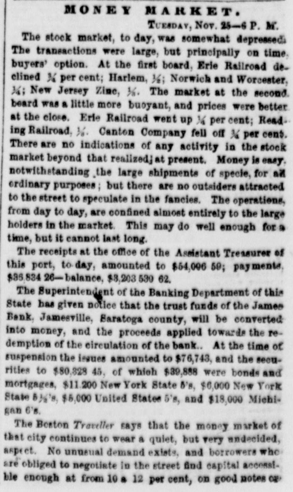 MONEY A M R K E T. TUESDAY, Nov. 25-6 P. M. The stock market, to day, was somewhat depressed The transactions were large, but principally on time buyers' option. At the first board, Erie Railroad declined 1/4 per cent; Harlem, 1/2; Norwich and Worcester, 14: New Jersey Zine, 1/2. The market at the second beard was a little more buoyant, and prices were better at the close. Erie Railroad went up 1/4 per cent; Read ing Railroad, % Canton Company fell off 1/4 per cent. There are no indications of any activity in the stock market beyond that realized} at present. Money is easy. notwithstanding the large shipments of specie, for all ordinary purposes ; but there are no outsiders attracted to the street to speculate in the fancies. The operations, from day to day, are confined almost entirely to the large holders in the market This may do well enough for a time, but it cannot last long. The receipts at the office of the Assistant Treasurer of this port, to day, amounted to $54,006 59; pay mente. $86,834.26-balance, $8,203,530 62. The Superintendent of the Banking Department of this State has given notice that the trust funds of the James Bank, Jamesville, Saratoga county, will be converted into money, and the proceeds applied towards the redemption of the circulation of the bank. At the time of suspension the issues amounted to $76,743, and the securities to $80,328 45, of which $39,888 were bonds and mortgages, $11.200 New York State 5's, $6,000 New York State 51/'e, $5,000 United States 5's, and $18,000 Michigan 6's. The Beston Traveller says that the money market of that city continues to wear a quiet, but very undecided, aspect. No unusual demand exists, and borrowers who are obliged to negotiate in the street find capital accessible enough at from 10 a 12 per cent, on good notes or