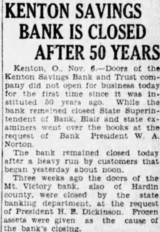 Kenton o Nov 6 - Doors of the Kenton Savings Bank and Trust Company, did not open for business today for the first time since it was instituted 50 years ago. While the bank remained closed state supuertendent of banks, Blair and state examiners went over the books at the request of bank President W. A. Norton. The bank remained closed today after a heavy run by customers that began yesterday about noon. Three weeks ago the doors of the Mt. Victory bank also of Hardin County were closed by the state banking department, at the request of President H., E. Dickinson. Frozen assets were given at the cause of the banks closing.