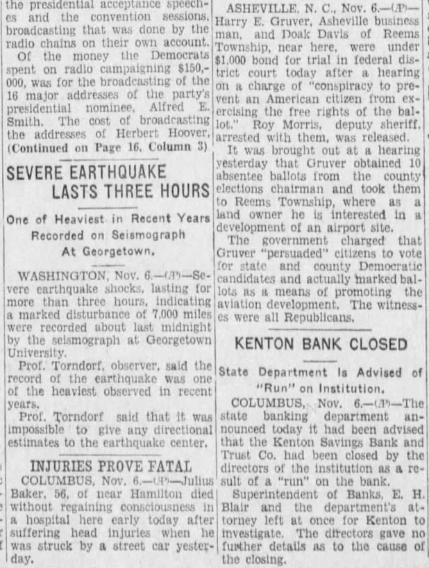 Nov. Harry Asheville business and Doak Davis Reems near under for trial federal district court today after hearing charge "conspiracy to an citizen the free of the Morris, deputy sheriff. with them. was released. It out hearing yesterday that Gruver obtained absentee ballots from county elections chairman took them Reems Township, where owner he interested in development of an airport The government charged that Gruver "persuaded" citizens to vote state county Democratic WASHINGTON Nov. and actually lasting for as means of promoting the more than three The witnessof miles were all Republicans. about last midnight the seismograph at Georgetown KENTON BANK CLOSED Prof. Torndorf observer, said the State Department Is Advised of the earthquake "Run" Institution. the heaviest observed in recent years. COLUMBUS, Prof. Torndorf said that was state banking department impossible any directional nounced today had been advised estimates to the earthquake center. that the Kenton Savings Bank and Trust Co. had been closed by the INJURIES PROVE FATAL directors the institution COLUMBUS, Nov. sult "run" on the bank. Baker. 56. of near Hamilton Superintendent Blair and department's hospital here early today torney left once for Kenton head injuries investigate. The gave struck by street car yester- further details as to the cause the closing.