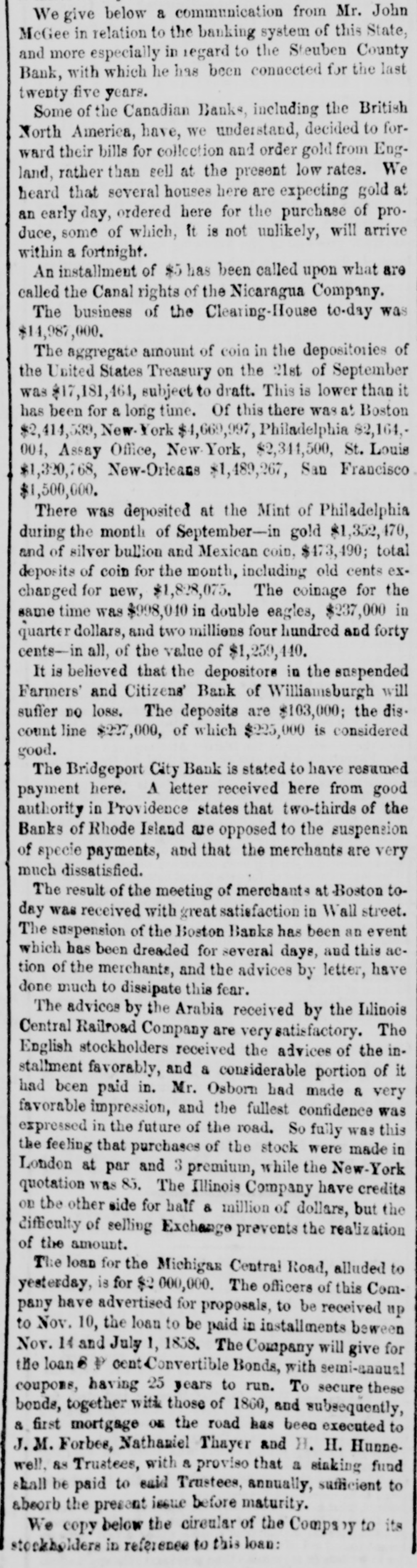 We give below a communication from Mr. John McGee in relation to the banking system of this State, and more especially in regard to the Steuben County Bank, with which he has been connected for the last twenty five years. Some of the Canadian Banks, including the British North America, have, we understand, decided to forward their bills for collection and order gold from England, rather than sell at the present low rates. We heard that several houses here are expecting gold at an early day, ordered here for the purchase of produce, some of which, it is not unlikely, will arrive within a fortnight. An installment of $5 has been called upon what are called the Canal rights of the Nicaragua Company. The business of the Clearing-House to-day was $14,987,000. The aggregate amount of coin in the depositories of the United States Treasury on the 21st of September was $17,181,461, subject to draft. This is lower than it has been for a long time. Of this there was at Boston $2,414,539, New York $4,669,997, Philadelphia 82,164, 004, Assay Office, New-York, $2,341,500, St. Louis $1,320,768, New-Orlears $1,489,267, San Francisco $1,500,000. There was deposited at the Mint of Philadelphia during the month of September-in gold $1,352,470 and of silver bullion and Mexican coin, $473,490; total deposits of coin for the month, including old cents exchanged for new, $1,828,075. The coinage for the same time was $998,040 in double eagles, $237,000 in quarter dollars, and two millions four hundred and forty cents-in all, of the value of $1,259,440. It is believed that the depositore in the suspended Farmers' and Citizens' Bank of Williamsburgh will suffer no loss. The deposits are $103,000; the dis. count line $227,000, of which $225,000 is considered good. The Bridgeport City Bank is stated to have resumed payment here. A letter received here from good authority in Providence states that two-thirds of the Banks of Rhode Island are opposed to the suspension of specie payments, and that the merchants are very much dissatisfied. The result of the meeting of merchants at Boston today was received with great satisfaction in Wall street. The suspension of the Boston Banks has been an event which has been dreaded for several days, and this action of the merchants, and the advices by letter, have done much to dissipate this fear. The advices by the Arabia received by the Illinois Central Railroad Company are very satisfactory. The English stockholders received the advices of the installment favorably, and a considerable portion of it had been paid in. Mr. Osborn had made a very favorable impression, and the fullest confidence was expressed in the future of the road. So fully was this the feeling that purchases of the stock were made in London at par and 3 premium, while the New-York quotation was 85. The Illinois Company have credits on the other side for half & million of dollars, but the difficulty of selling Exchange prevents the realization of the amount. The loan for the Michigan Central Road, alluded to yesterday, is for $2 000,000. The officers of this Company have advertised for proposals, to be received up to Nov. 10, the loan to be paid in installments beween Nov. 14 and July 1, 1858. The Company will give for the loan 8 ₽ cent Convertible Bonds, with semi-anaual coupons, having 25 years to run. To secure these bonds, together with those of 1860, and subsequently, & first mortgage OE the road has been executed to J. M. Forbes, Nathaniel Thayer and H. H. Hunne. well, as Trustees, with & proviso that a sinking fund shall be paid to said Trustees, annually, sufficient to absorb the present issue before maturity. We copy below the circular of the Company to its stockholders in reference to this loan: