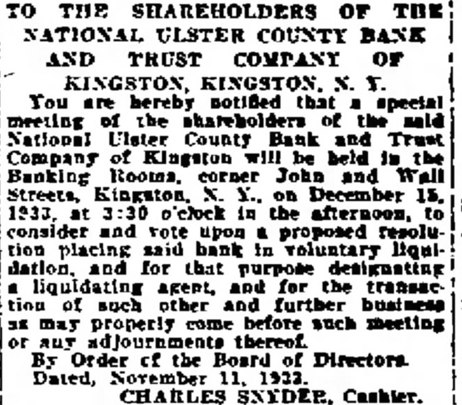 TO THE SHAREHOLDERS OF THE NATIONAL COUNTY BANK AND TRUST COMPANY OF You are hereby notified that special of the shareholders of the said National Ulster County Bank and Trust Company of Kingston will be held is Banking Rooms. corner John and Wall consider upon proposed resolu tion placing bank liquidation. for that purpose designating liquidating and the tion such other and further business " may properly come before such meeting By Order of the Board Directors Dated,