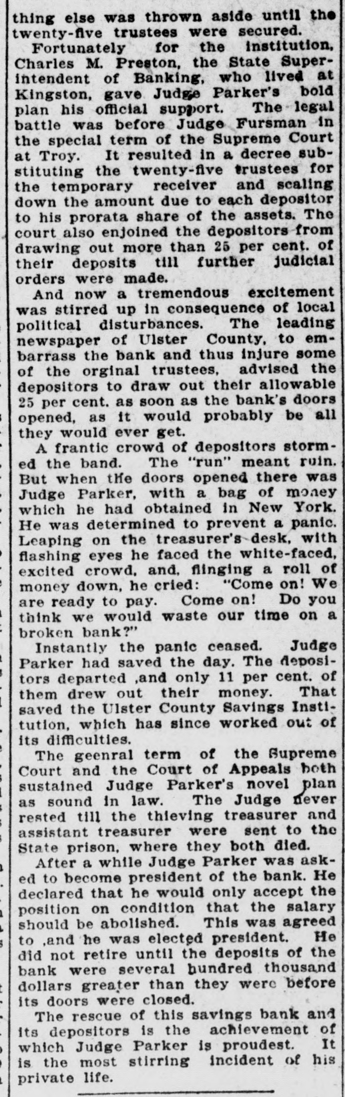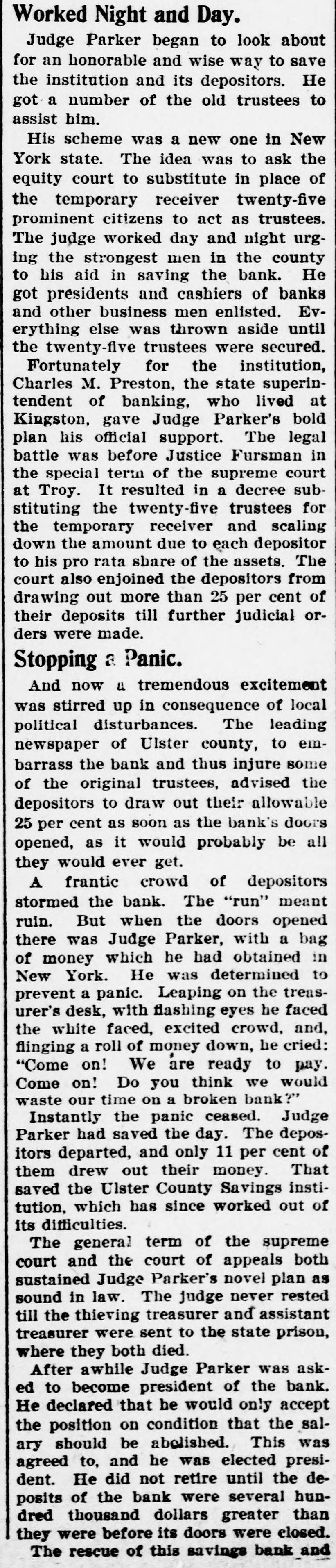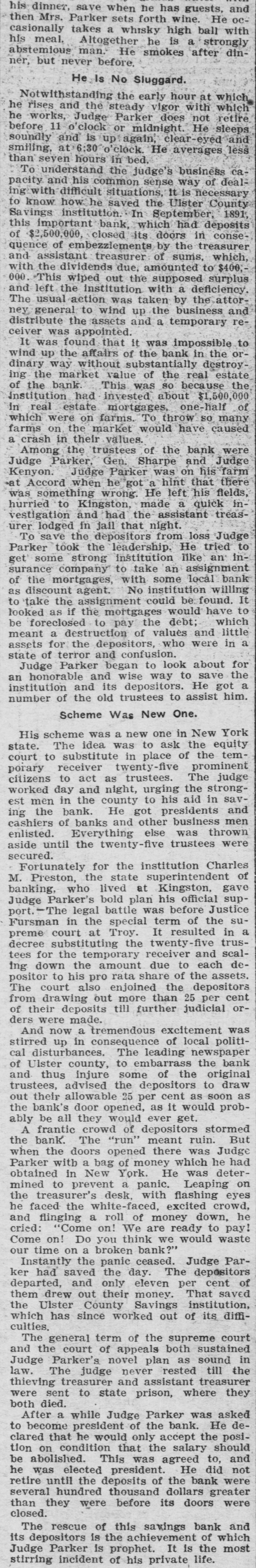 and his dinner, Parker save when sets forth he has wine. guests, ball He with octhen Mrs. takes a whisky high is a strongly abstemious man. his casionally meal, Altogether He smokes he after dinner, but never before. He Is No Sluggard. NotwIthstanding the early vigor hour with at which which retire and the steady does not o'clock he he rises works, Judge or Parker midnight. He sleeps and clear-eyed before soundly 11 and at 6:30 is up o'clock again, He averages less seven understand the judge's way of deal smiling, than To his hours common in bed. sense business is necessary capacity and difficult situations, It Ulster County ing with know how he saved In the September, 1891, Savings to important institution. bank, which doors had in deposits conse this $2,500,000, closed its by the treasurer of of embezzlements of sums, which, quence assistant treasurer amounted to $400, and dividends due, supposed surplus with the wiped out the with a deficiency. 000. and left the taken by and This usual action institution was the business the attor- reney The general the to assets wind and up a temporary that in distribute ceiver was appointed. it was impossible the or- to wind It was up way the found without affairs of substantially the of bank the real destroy- estate dinary market value so because the, $1,500,000 institution mortgages, ing of the the bank. had This invested was about one-half many of real estate To throw so caused in which were on the on market farms. would have farms a crash in their trustees values. of the and bank Judge were Among the Gen. Sharpe on his farm Parker, Parker was that there when he got He left his at Judge Kenyon. Accord Judge wrong. a hint quick fields, inwas something to Kingston, made assistant a treashurried and had the night. from vestigation in jail that loss Judge lodged the depositors He tried to To save the leadership. like an urer Parker took strong institution an assignment bank inget' some company to with take some local willing surance the mortgages, No institution found. It as of discount the agent. assignment could would be. have to to as if the the debt; meant looked take foreclosed to mortgages pay values and which little a depositors, be a destruction of who were in state assets of for terror Parker the and began confusion. to way look to about save the for a the Judge honorable and wise depositors. He got him. an institution and old its trustees to assist number of Scheme Was New One. in York New idea of His scheme was was a new to one ask the the equity temstate. porary court citizens to The receiver to substitute act as twenty-five trustees. in urging place the The prominent strong- judge savday and night, to his aid in and worked est men in bank. the county He got presidents business men ing the of banks and other else was thrown cashiers enlisted. until Everything the twenty-five trustees were aside secured. Fortunately the for state the institution superintendent Charles gave of M. Preston, lived at Kingston, official supbanking, Parker's who bold plan was his before Justice at Judge Fursman port.-The in legal the battle Troy. special It term resulted of the trus- in su- a twenty-fi preme decree substituting court the receiver and scal- defor the temporary due to each tees ing down the amount rata share of the depositors assets. positor court to his also pro enjoined than the 25 per cent of their deposits The from drawing out till more further judicial orders were made. tremendous excitement politi- was And now a consequence of local newspaper stirred up in The leading the cal county, to of the Ulster disturbances. embarrass original draw bank and of thus advised injure the some depositors cent as to soon as trustees, out their allowable 25 per as it would probthe bank's door opened, would ever get. ably be all they crowd of depositors ruin. stormed But A frantic The "run" meant Judge the doors which he had when the bank. with a bag opened of money there He was was deterParker York. on obtained in prevent New a panic. flashing eyes he mined treasurer's to desk, with excited Leaping crowd, of the faced the white-faced, money down, he and flinging a on! roll We are ready to waste pay! cried: 'Come you think we would Come on a broken our time on! Do panic ceased. bank?" Judge ParInstantly the The depositors of departed, ker had only eleven per saved saved and out their the day. money. That institution, cent them drew County Savings diffiwhich the Ulster has since worked out of its culties. The general term of the both supreme sustained court and the Parker's court of novel appeals plan rested as sound till the in to state sent were thieving law. Judge The treasurer judge and never prison, assistant where treasurer they both asked died. while Judge Parker was He deAfter a president of the bank. the posiclared to become that condition he would that only the accept salary to, should and tion abolished. on This was agreed He did not than he retire be was until elected the deposits thousand president. of dollars the bank greater were were several they hundred were before its doors and closed. rescue of this savings bank of which The depositors is the achievement It is the most its Parker is prophet. life. stirring Judge incident of his private