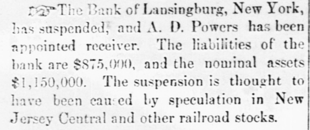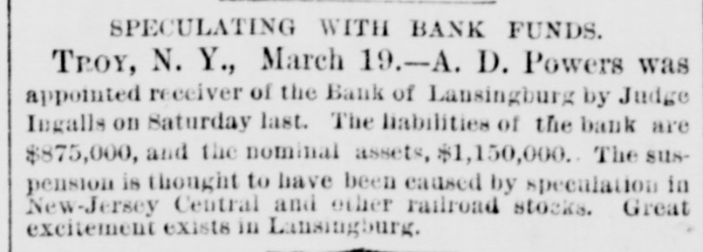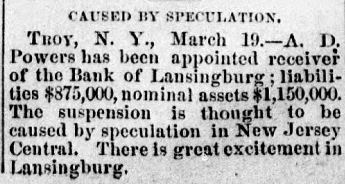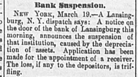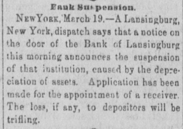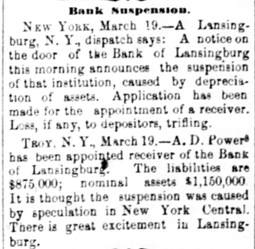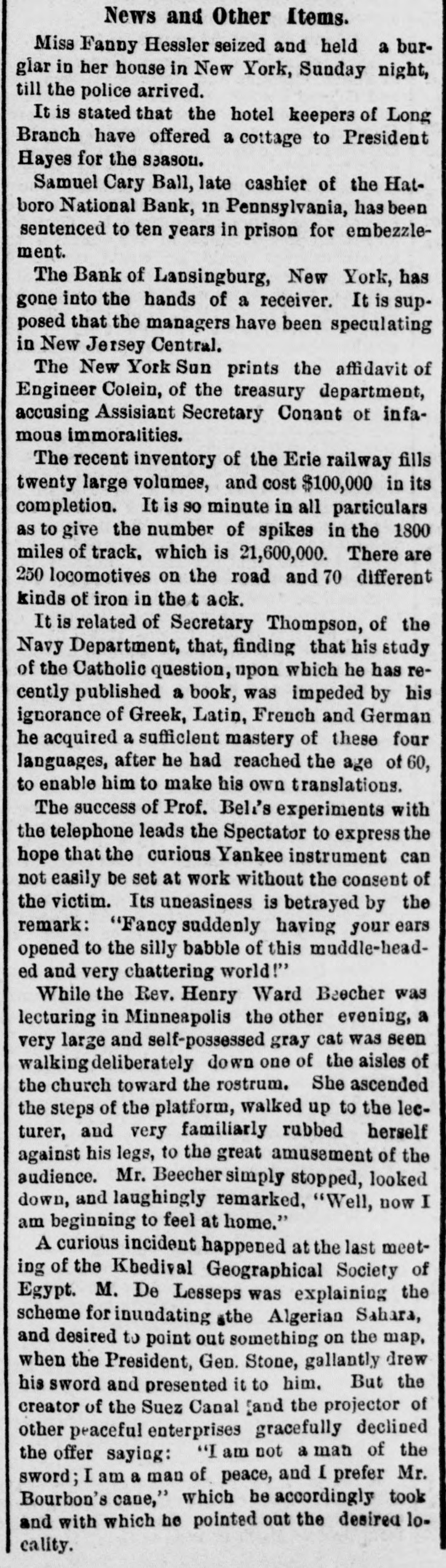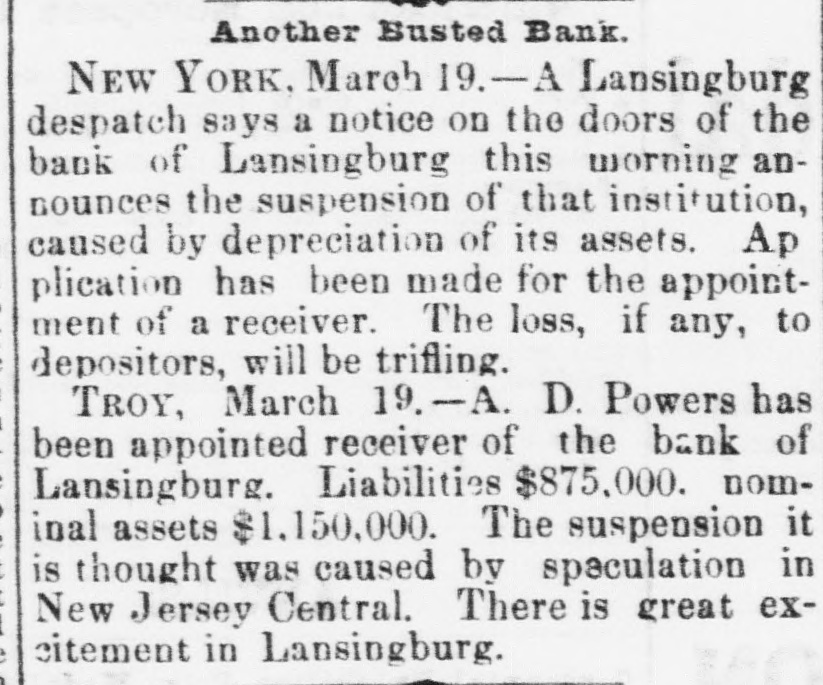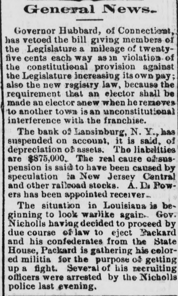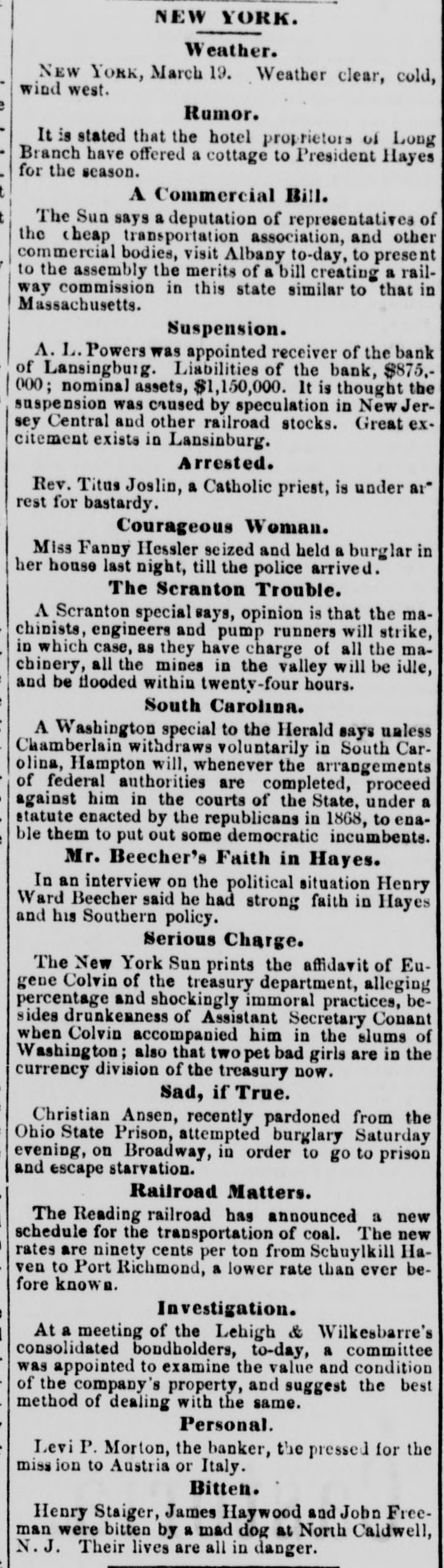 NEW YORK. Weather. NEW YORK, March 19. Weather clear, cold, wind west. e Rumor. It is stated that the hotel proprietors of Long . Branch have offered a cottage to President Hayes for the season. t A Commercial Bill. t The Sun says a deputation of representatives of the cheap transportation association, and other commercial bodies, visit Albany to-day, to present to the assembly the merits of a bill creating a railway commission in this state similar to that in Massachusetts. Suspension. A. L. Powers was appointed receiver of the bank of Lansingburg. Liabilities of the bank, $875.000; nominal assets, $1,150,000. It is thought the suspension was caused by speculation in New Jersey Central and other railroad stocks. Great excitement exists in Lansinburg. Arrested. Rev. Titus Joslin, a Catholic priest, is under at rest for bastardy. Courageous Woman. Miss Fanny Hessler seized and held a burglar in her house last night, till the police arrived. The Scranton Trouble. A Scranton special says, opinion is that the machinists, engineers and pump runners will strike, in which case, as they have charge of all the machinery, all the mines in the valley will be idle, and be flooded within twenty-four hours. South Carolina. A Washington special to the Herald says unless Chamberlain withdraws voluntarily in South Carolina, Hampton will, whenever the arrangements of federal authorities are completed, proceed against him in the courts of the State, under a statute enacted by the republicans in 1868, to ena) ble them to put out some democratic incumbents. Mr. Beecher's Faith in Hayes. In an interview on the political situation Henry Ward Beecher said he had strong faith in Hayes and his Southern policy. Serious Charge. The New York Sun prints the affidavit of Eugene Colvin of the treasury department, alleging percentage and shockingly immoral practices, besides drunkenness of Assistant Secretary Conant when Colvin accompanied him in the slums of Washington; also that two pet bad girls are in the currency division of the treasury now. Sad, if True. Christian Ansen, recently pardoned from the Ohio State Prison, attempted burglary Saturday evening, on Broadway, in order to go to prison and escape starvation. Railroad Matters. The Reading railroad has announced a new schedule for the transportation of coal. The new rates are ninety cents per ton from Schuylkill Haven to Port Richmond, a lower rate than ever before known. Investigation. ) I At a meeting of the Lehigh & Wilkesbarre's consolidated bondholders, to-day, a committee was appointed to examine the value and condition of the company's property, and suggest the best method of dealing with the same. Personal. Levi P. Morton, the banker, the pressed for the mission to Austria or Italy. Bitten. Henry Staiger, James Haywood and John Freeman were bitten by a mad dog at North Caldwell, N. J. Their lives are all in danger.