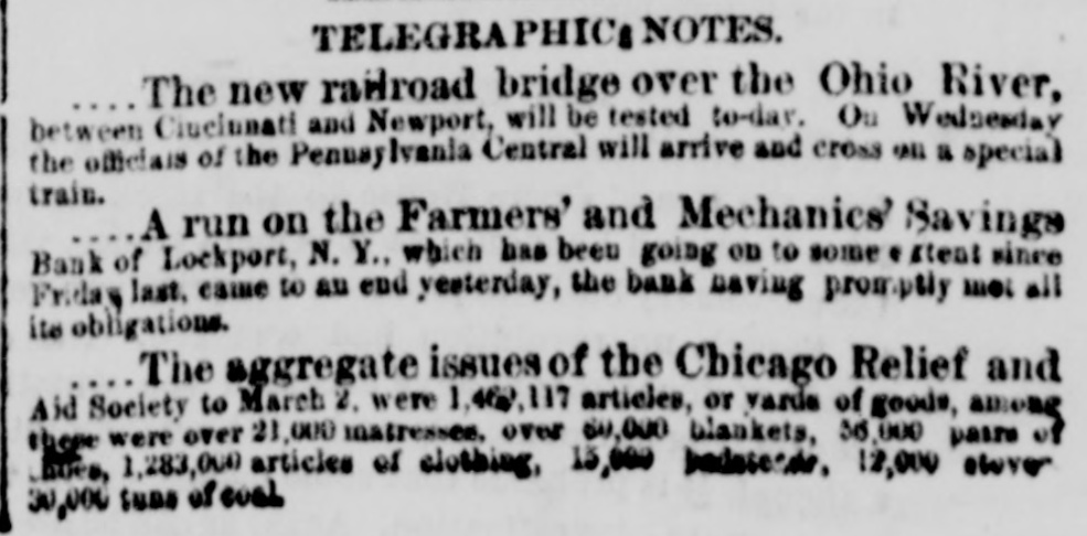 TELEGRAPHICS NOTES. The new radroad bridge over the Ohio River, between Ciuclunati and Newport, will be tested to-dar. Ou Wednesday the officials of the Penusy Ivania Central will arrive and cross all a special train. A run on the Farmers' and Mechanics' Savings Bank of Lockport, N. Y., which has been going OD to some . stent sinre Friday last. came to au end yesterday, the bank having promptly mol all its obligations. The aggregate issues of the Chicago Relief and Aid Society to March 2. were 1,462,117 articles, or varde of goods, among there were over 21. 000 instressee. over www. blankets, 56,000 pairs of Dues, 1,283,000 articles of clothing, 15,000 12,000 owner 30,000 Suns of even