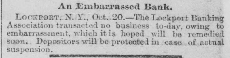 An Embarrassed Bank. LOCKPORT. N.Y., Oct.20.-The Lockport Banking Association transacted no business to-day, owing to embarrassment, which it is hoped will be remedied soon. Depositors will be protected in case of actual suspension.