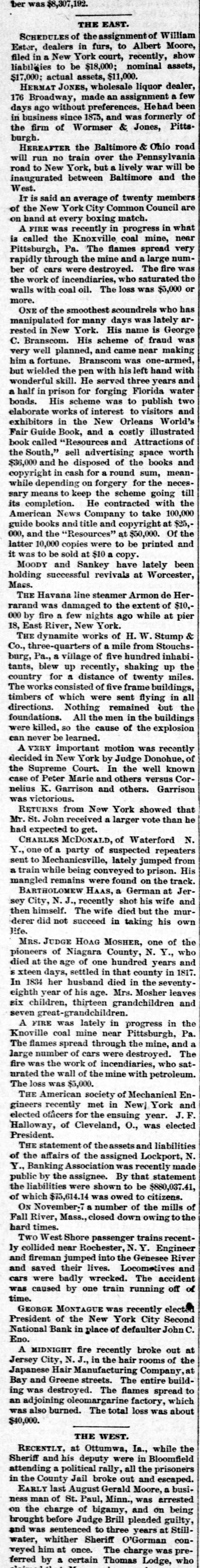SUM per THE EAST. SCHEDULES of the assignmentof William Ester, dealers in furs, to Albert Moore, filed in a New York court, recently, show liabilities to be $18,000; nominal assets, $17,000; actual assets, $11,000. HERMAT JONES, wholesale liquor dealer, 176 Broadway, made an assignment a few days ago without preferences. Hehad been in business since 1875, and was formerly of the firm of Wormser & Jones, Pitts. burgh. HEREAFTER the Baltimore & Ohio road the JOAO that ou una IIIM road to New York, but a lively war will be inaugurated between Baltimore and the 4se M IT is said an average of twenty members of the New York City Common Council are on hand at every boxing match. u! progress u! receitty SUM THE V is called the Knoxville coal mine, near Pittsburgh, Pa. The flames spread very rapidly through the mine and a large number of cars were destroyed. The fire was the work of incendiaries, who saturated the walls with coal oil. The loss was $5,000 or more. ONE of the smoothest scoundrels who has manipulated for many days was lately arrested in New York. His name is George SUM Jo scheme S!H Branscom. O very well planned, and came near making him a fortune. Branscom was one-armed, but wielded the pen with his left hand with wonderful skill. He served three years and a half in prison for forging Florida water bonds. His scheme was to publish two elaborate works of interest to visitors and exhibitors in the New Orleans World's Fair Guide Book, and a costly illustrated book called "Resources and Attractions of the South," sell advertising space worth $36,000 and he disposed of the books and copyright in cash for a round sum, meanwhile depending on forgery for the necessary means to keep the scheme going till its completion. He contracted with the American News Company to take 100,000 guide books and title and copyright at $25,the JO *000'00$ 18 the pus '000 latter 10,000 copies were to be printed and *Adoo B 01$ 18 p[os eq 04 SUM # MOODY and Sankey have lately been holding successful revivals at Worcester, Mass. THE Havana line steamer Armon de Her-'OIS Jo exteet the 01 persurep SEM PUBLIC 000 by fire a few nights ago while at pier 18, East River, New York. -8 dumas 'M 'H JO SHIOM 3HJ Co., three-quarters of a mile from Stouchsburg, Pa., a village of five hundred inhabitants, blew up recently, shaking up the country for a distance of twenty miles. The works consisted of five frame buildings, timbers of which were sent flying in all directions. Nothing remained but the foundations. All the men in the buildings were killed, SO the cause of the explosion can never be learned. A VERY important motion was recently decided in New York by Judge Donohue, of the Supreme Court. In the well known case of Peter Marie and others versus Cornelius K. Garrison and others. Garrison was victorious. RETURNS from New York showed that Mr. St. John received a larger vote than he had expected to get. CHARLES MCDONALD, of Waterford N. sepeeters subsetted JO Abrut B JO euo "A sent to Mechanicsville, lately jumped from a train while being conveyed to prison. His mangled remains were found on the track. BARTHOLOMEW HAAS, a German at Jersey City, N. J., recently shot his wife and then himself. The wife died but the murderer did not succeed in taking his own life. MRS. JUDGE HOAG MOSHER, one of the pioneers of Niagara County, N. Y., who died at the age of one hundred years and $ xteen days, settled in that county in 1817. In 1834 her husband died in the seventyeighth year of his age. Mrs. Mosher leaves six children, thirteen grandchildren and seven great-grandchildren. A FIRE was lately in progress in the Knoville coal mine near Pittsburgh, Pa. The flames spread through the mine, and a large number of cars were destroye The -188 oum JO MJOM the SBM e.rg urated the wall of the mine with petroleum. *000'0$ SUM SSO[ The THE American society of Mechanical Engineers recently met in New] York and elected officers for the ensuing year. J.F. Halloway, of Cleveland, O., was elected President. THE statement of theassets and liabilities of the affairs of the assigned Lockport, N. Y., Banking Association was recently made public by the assignee. By that statement the liabilities were shown to be $880,037.41, of which $75,614.14 was owed to citizens. ON November-7 a number of the mills of Fall River, Mass., closed down owing to the hard times. Two West Shore passenger trains recently collided near Rochester, N.Y. Engineer and fireman jumped into the Genesee River and saved their lives. Locometives and cars were badly wrecked. The accident Jo No that euo Aq cansed SUM *earg GEORGE MONTAGUE was recently elected President of the New York City Second National Bank in place of defaulter John C. Eno. to ano blood recentily ere LHOINGIN V Jersey City, N.J., in the hair rooms of the Japanese Hair Manufacturing Company, at Bay and Greene streets. The entire building was destroyed. The flames spread to an adjoining oleomargarine factory, which was also burned. The total loss was about *000'01$ THE WEST. RECENTLY, at Ottumwa, Ia., while the Sheriff and his deputy were in Bloomfield attending a political rally, all the prisoners in the County Jail broke out and escaped. EARLY last August Gerald Moore, a business man of St. Paul, Minn., was arrested on the charge of bigamy, and on being brought before Judge Brill pleaded guilty, -mas 10 years $2.00 04 servenced SUM put water, whither Sheriff O'Gorman conweyed him at once. The charge was preferred by a certain Thomas Lodge. who