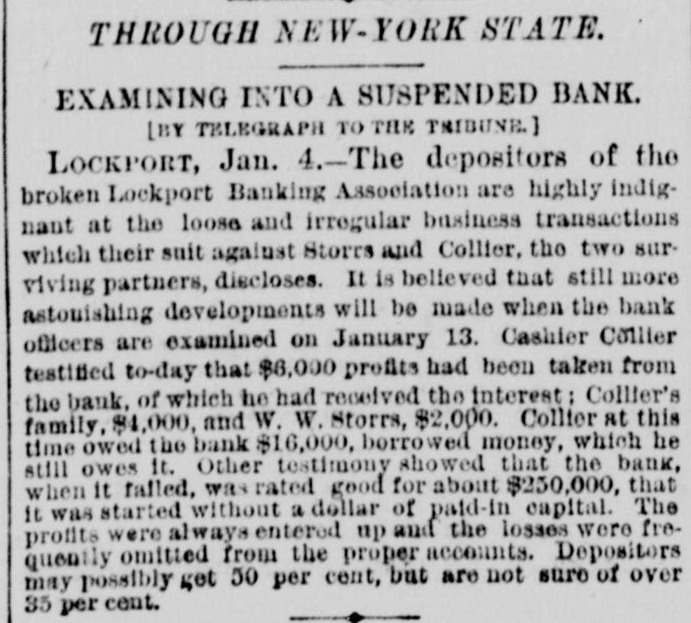 THROUGH NEW-YORK STATE. EXAMINING INTO A SUSPENDED BANK. [BY TELEGRAPH TO THE TNIBUNE.] LOCKPORT, Jan. 4.-The depositors of the broken Lockport Banking Association are highly indignant at the loose and irregular business transactions which their suit against Storrs and Collier, the two surviving partners, discloses. It is believed that still more astouishing developments will be made when the bank officers are examined on January 13. Cashier Collier testified to-day that $6,000 profits had been taken from the bank, of which he had received the interest: Collier's family, $4,000, and W. W. Storrs, $2,000. Collier at this time owed the bank $16,000, borrowed money, which he still owes it. Other testimony showed that the bank, when it failed, was rated good for about $250,000, that it was started without a dollar of paid-in capital. The profits were always entered up and the losses were frequently omitted from the proper accounts. Depositors may possibly get 50 per cent, but are not sure of over 35 per cent.