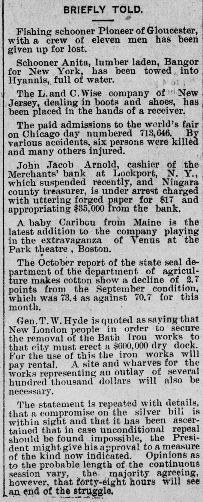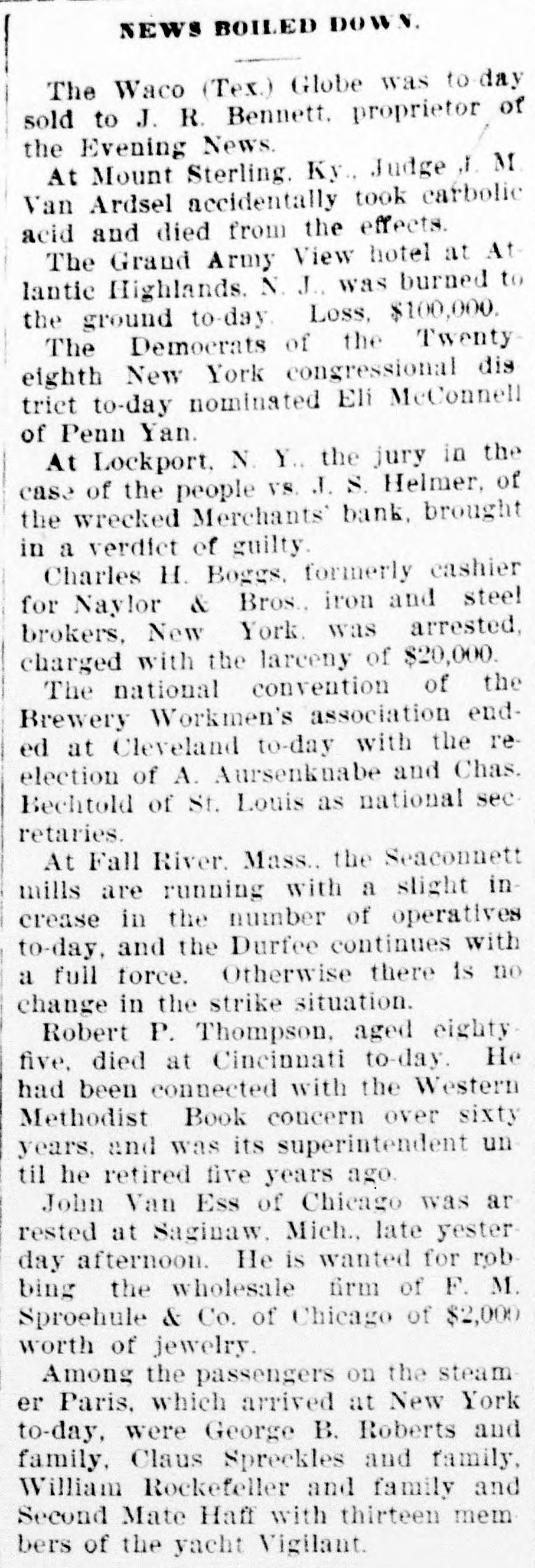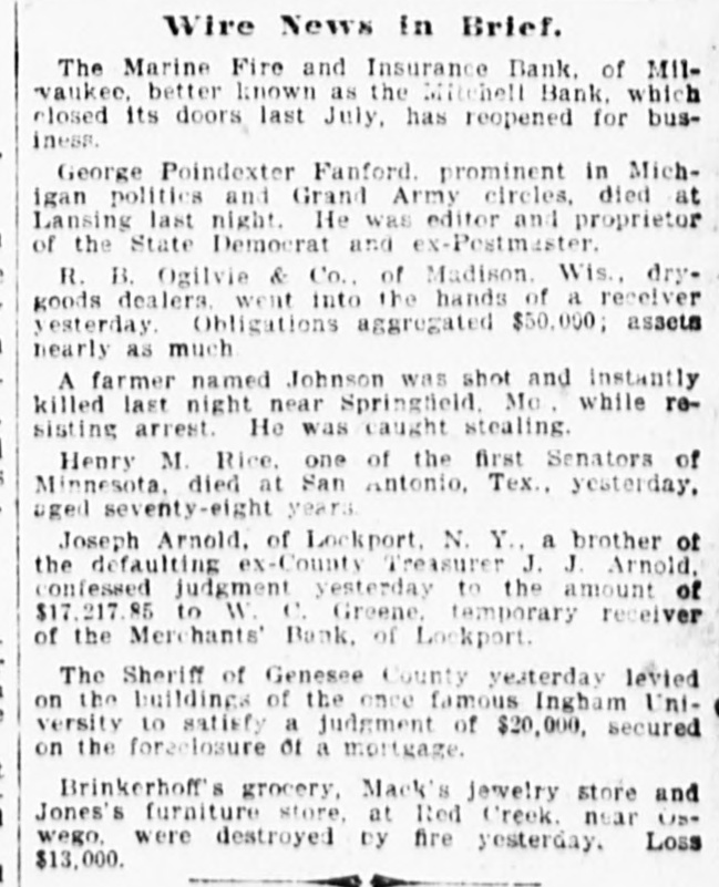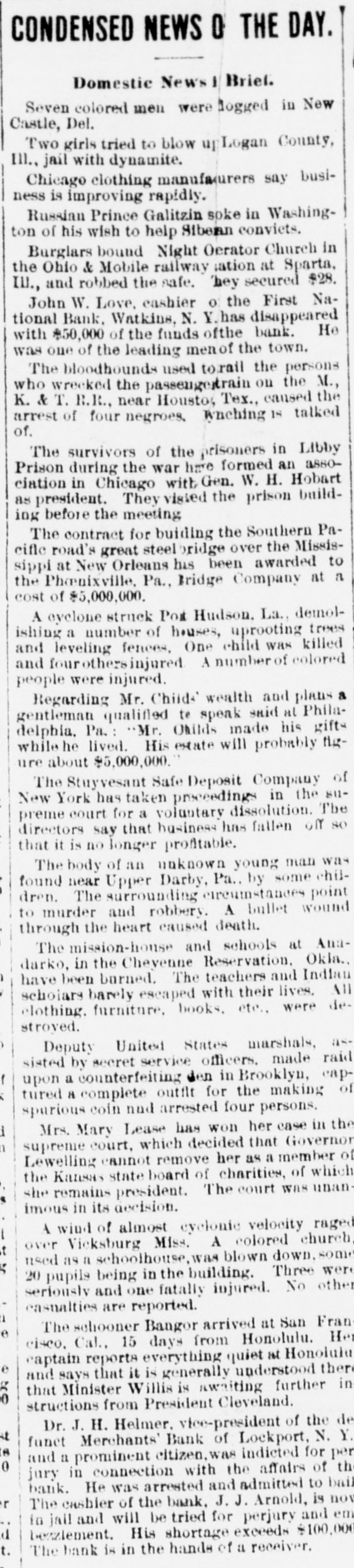 Penn at Hyndman, Pa Bank at Albany. Mo Oliver Iron & Steel company of Pittsburgh, Pa.; $700,000 Standard Wagon company at Cincinnati: $700,000. Aug 25-Ford county and First national banks at Paxton, III. Aug. 22-Samuel W. Clark, lumber dealer of Zanesville, O.: $1,500,000. Aug. 24-Navarro Mill company in San Francisco, $1,000,000 Dillon national bank at Helena, Mont Aug. 28-First national bank of York, Neb George C. Cribb, dealer in agricultural implements in Milwaukee; $600,000. Aug. 30-Nicaragua Canal Construction company of New York. Sep 1-Equitable Mortgage Ca of Missouri, at New York: $19,000,000 Denver (Col.) savings bank; $670,000. Sep. 18-Crippen. Lawrence & Co., Denver loan concern: $1,000,000. Sep. 19-Mast. Bufford & Burwell Carriage company at St. Paul: $1,200,000. Oct. 6-Merchants' bank of Lockport, N. Y. Oct. 18-National bank at Hutchinson, Kan., $135,000. Nov. 1-James C. Savery. proprietor of the largest hotel in Iowa, assigned at New York; $1,000,000. Nov. 22-American Casualty company in New York; $1,700,000. Dec. 11-Receivers appointed for agricultural implement establishment of C. Aultman & Co. at Canton, O.: $1,000,000. Dec. 15-Crane Iron company of Philadelphia; $700,000. Dec. 21-St Nicholas bank in New York. Dec. 23-Bank of Greensburg, Kan Other banking houses that succumbed to the financial troubles of the year were as follows: Capital national. Lincoln, Neh: State bank, Wahoo. Neb.: U. S. Banking company, Gervais, Ore: Bank of commerce. Nashville, Tenn.: Northwestern state bank. Sibley, la Central savings bank, Lansing, Mich.; Bank of Milbank, S. D.: First national bank, Ponce, Neb.; Ingham county savings bank, Lansing, Mich.: Second national bank, Columbia, Tenn.: Bank of Salem, S. D.; Kissamee (Fla) city bank: Bank of the Carolinas, Florence, S. C.: First national bank, Cedar Falls. Ia: Citizens bank, Minneapolis, Minn.: Bank of Zumbrota. Minn.: Evanston (III.) National bank: Oglethorpe national bank and Brunswick national bank, Brunswick, Ga.: Farmers' state bank, Brooklyn, Mich.; Brunswick (Ga.) state bank: Bank of Puyallup, Wash: National bank of North Dakota, Fargo: White county bank. Beebe, Ark.: Potter's bank. Paulding, O.; Merchants' national bank. Fort Worth, Tex.: Savings bank. Sandusky, 0.; State bank, Cortland, Neb.: Bedford (Ind.) bank: City bank, Carbondale, Ill.: Deflance (O.) savings bank: State bank, Manitowoc. Wis: Bank of Two Rivers, Wis.: New Albany (Ind.) Banking Co.; Shell Lake savings bank, Washburn, Wis.: banks at Mascoutah. Ill. Hudson, Wis., Ellenburg, Wash., Missoula, Mont. Gillespie, III: Park City bank at Salt Lake City; McCague savings bank at Omaha. Neb.: bank at Everett, Wash.: Riverside (Cal) Banking company; banks at Lebanon and Albany in Oregon, and Hanover. N. C: bank a: Ridgeway, Me Columbia bank at New Whatcom. Wash: Cataract bank at Niagara Falls, N. Y.; Sabina(O bank: First national bank of Provo. U.T.: Chaffee county bank at Salida. Col.; First national at Phillipsburg, Mont: First national bank of Cisco, Tex.: Jefferson county bank at Bolden, Col: Everett (Wash.) national bank; Arkansas state bank of Stuttgart; Arkansas Farmers' and Traders' bank at Dewitt: Somerset county bank at Trenton, N. J.; State bank at Shubert, Neb: Holt county bank at O'Neil, Neb.; First national bank of Cedartown. Ga.: Bank of Sterling and Bank of Loveland, Col.: Hutchinson (Kan.) national bank; Bank of Parker, Kan.: Woodson bank of Yates Center, Kan.: First national bank of Harrisonville, Mo.; First national bank of Anthony, Kan.: Bank of Belleville, Kan: First national bank. at Cheyenne, Wyo.: First national bank at Canyon City, Col: Union bank at Greeley, Col.; Bank of Crested Butte, Col.: Traders' bank at Tacoma, Wash.: Plainview (Neb.) state bank: First national at Orlando, Fla: Tacoma (Wash.) national bank; National bank of the Commonwealth and Bank of New England at Manchester, N. H.; Commercial national. Ainsworth national and Portland savings banks at Portland. Ore.: Ex-