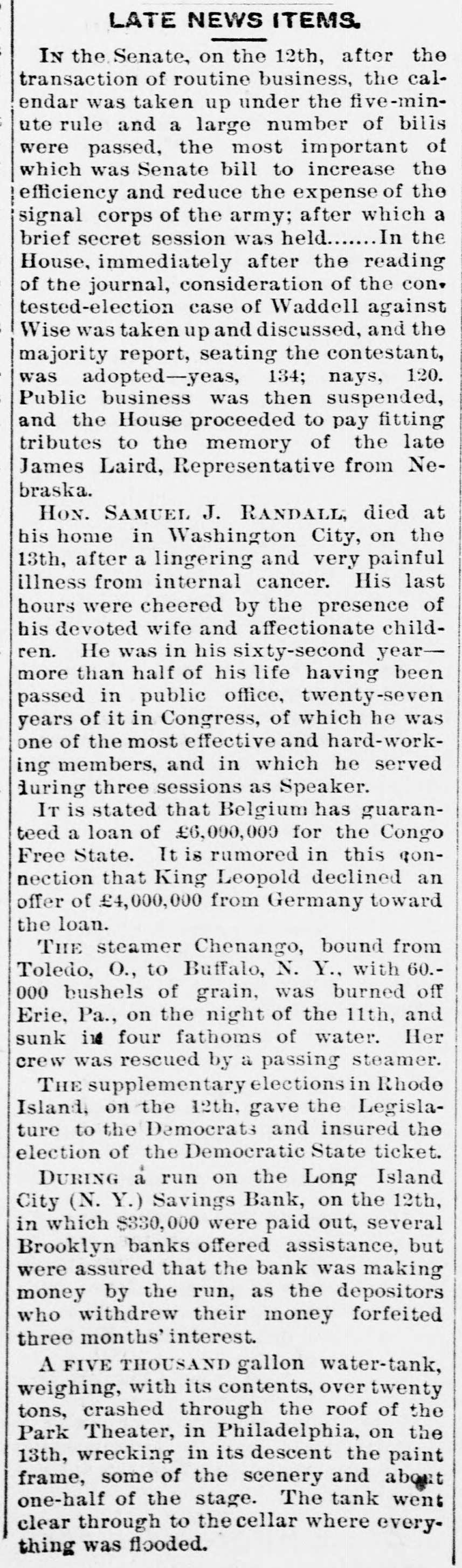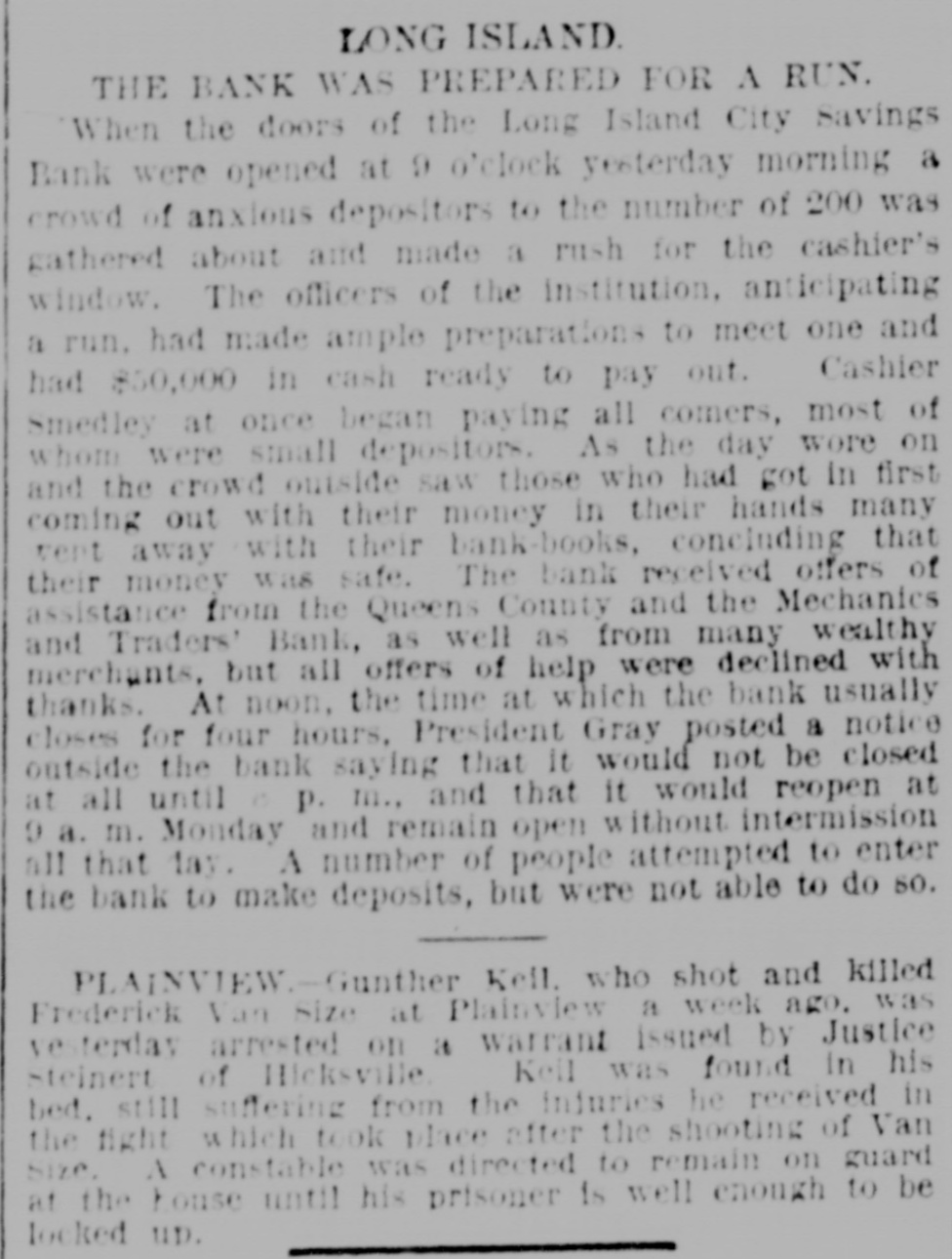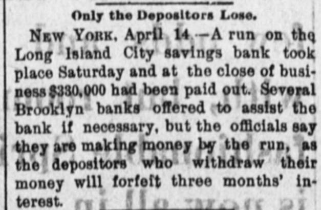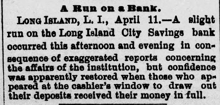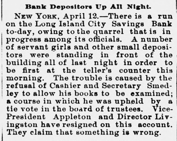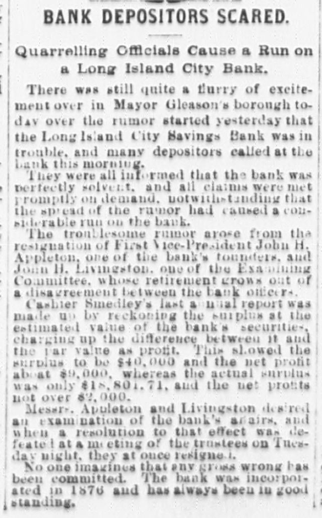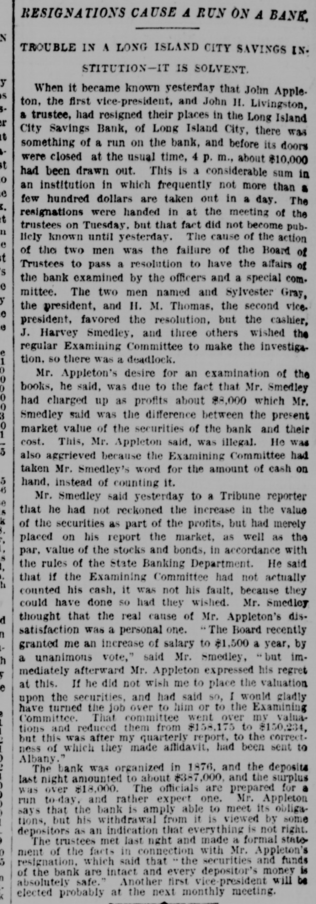 RESIGNATIONS CAUSE 4 RUN ON A BANK. Z TROUBLE IN A LONG ISLAND CITY SAVINGS INSTITUTION-IT IS SOLVENT. When it became known yesterday that John Apples ton, the first vice-president, and John H. Livingston, a trustee, had resigned their places in the Long Island r City Savings Bank, of Long Island City, there was it something of a run on the bank, and before its doors were closed at the usual time, 4 p. m., about $10,000 st had been drawn out. This is a considerable sum in o an institution in which frequently not more than & e few hundred dollars are taken out in a day. The I. resignations were handed in at the meeting of the t trustees on Tuesday, but that fact did not become pubn licly known until yesterday. The cause of the action e of the two men was the failure of the Board of t Trustees to pass a resolution to have the affairs of S the bank examined by the officers and a special come mittee. The two men named and Sylvester Gray, the president, and H. M. Thomas, the second vice. e president, favored the resolution, but the cashier, e J. Harvey Smedley, and three others wished the regular Examining Committee to make the investigation. so there was a deadlock. Mr. Appleton's desire for an examination of the 0 books, he said, was due to the fact that Mr. Smedley 0 had charged up as profits about $8,000 which Mr. 0 Smedley said was the difference between the present 0 market value of the securities of the bank and their cost. This, Mr. Appleton said, was illegal. He was 5 also aggrieved because the Examining Committee had taken Mr. Smedley's word for the amount of cash on hand, instead of counting it. 6 Mr. Smedley said yesterday to a Tribune reporter that he had not reckoned the increase in the value of the securities as part of the profits, but had merely placed on his report the market, as well as the par, value of the stocks and bonds, in accordance with the rules of the State Banking Department. He said that if the Examining Committee had not actually counted his cash, it was not his fault, because they could have done SO had they wished. Mr. Smedley thought that the real cause of Mr. Appleton's disd satisfaction was a personal one. "The Board recently granted me an increase of salary to $1,500 a year, by a unanimous vote," said Mr. Smedley, "but imh mediately afterward Mr. Appleton expressed his regret at this. If he did not wish me to place the valuation e upon the securities, and had said so, I would gladly have turned the job over to him or to the Examining Committee. That committee went over my valuations and reduced them from $158,175 to $150,234, but this was after my quarterly report, to the correct. ness of which they made affidavit, had been sent to Albany." The bank was organized in 1876, and the deposits last night amounted to about $387,000, and the surplus was over $18,000. The officials are prepared for a run to-day, and rather expect one. Mr. Appleton says that the bank is amply able to meet its obligations, but his withdrawal from it is viewed by some depositors as an indication that everything is not right. The trustees met last nght and made a formal statement of the facts in connection with Mr. Appleton's resignation, which said that the securities and funds of the bank are intact and every depositor's money is absolutely safe." Another first vice-president will be elected probably at the next monthly meeting.
