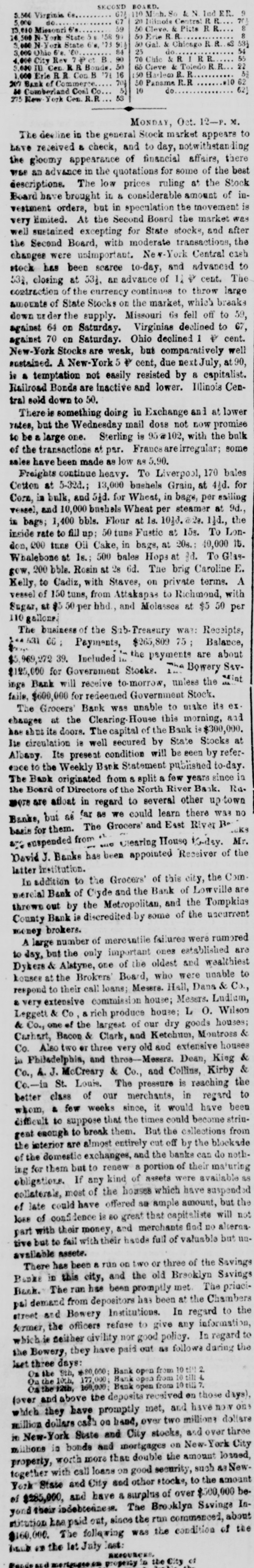 SECOND BOARD. 110 M So & N Ind ER. 9 67/3,500 Virginia 6s. 70} 67 20 Illinois Central R R.... do 5,000 8 59 50 Cleve. & Pitts R R.... 13,010 Missouri 6's 8 50 Erie R.R. 16,500 State 5 $ 158 99 50 Gal. & Chicago R R. sS 53} 3,000 York State 6's, '73 54 do 25 84 3,009 Ohio 6'e. 80 55 70 Chic & R R R. 4,000 City Rev et B 90 22 66 Cleve & Toledo R.R. 3,000 III Cen. R R. Bonds. 50 52 150 Harlem R. R 1,000 Erie RR Con B 71 16 #10 62 50 Panama R.R. 701 207 Bank of Commerce. 10 do 62) 5) 50 Comberland Coal Co 53 275 New York Cen. R.R. MONDAY, Oct. 12-P. M. The decline in the general Stock market appears to have received & check, and to day, notwithstan the gloomy appearance of financial affairs, there was an advance in the quotations for some of the best descriptions. The low prices ruling at the Stock Board have brought in & considerable amount of investment orders, but in speculation the movement is very limited. At the Second Board the market was well sustained excepting for State stocks, and after the Second Board, with moderate transactions, the changes were unimportant. Ne York Central cash stock has been scaree to-day, and advanced to 531, closing at 531, an advance of 11 V cent. The contraction of the currency continues to throw large amounts of State Stocks on the market, which breaks down DE der the supply. Missouri 6s fell off to 59, against 64 on Saturday. Virginias declined to 67, against 70 on Saturday. Ohio declined 1 P cent. New-York Stocks are weak, but comparatively well austained. A New-York 5 P cent, due July, at 90, is a temptation not easily resisted by a capitalist. Railroad Bonds are inactive and lower. Illinois Central sold down to 50. There something doing in Exchange and at lower rates, but the Wednesday mail doss not now promise to be a large one. Sterling is 95 102, with the balk of the transactions at par. Francs areirregular; some sales have been made as low as 5.90. Freights continue heavy. To Liverpool, 170 bales Cotton at 5-32d.; 13,000 bushels Grain, at 41d. for Corn, in bulk, and 51d. for Wheat, in bags, per sailing vessel, and 10,000 bushels Wheat per steamer at 9d., in bags; 1,400 bbls. Flour at 1s. 101d. @2a. 11d., the inside rate to fill up; 50 tuns Fustic at 15s. To London, 200 tune Oil Cake, in bags, at 20s.: 40,000 1b. Whalebone at 1s.; 500 bales Hops at fd. To Glasgow, 200 bble. Rosin at 2s 6d. The brig Caroline E. Kelly, to Cadiz, with Staves, on private terms. A vessel of 150 tuns, from Attakapas to Richmond, with Sugar, at $5 50 per hhd., and Molasses at $5 50 per 110 gallons The business of the Sub-Treasury was: Receipts, 66; Payments, $265,809 75; Balance, $5,969,272 39. Included 12. the payments are about $125,000 for Government Stocks. The Bowery Savinge Bank will receive to-morrow, unless the Mint fails, $600,000 for redeemed Government Stock. The Grocers' Bank was unable to make its ex. changes at the Clearing-House this morning, and has shut its doors. The capital of the Bank is $300,000. Its circulation is well secured by State Stocks at Albany. Its present condition will be seen by reference to the Weekly Bank Statement published to-day. The Bank originated from a split a few years since in the Board of Directors of the North River Bank. Ra. more are afloat in regard to several other up town Banks, but as far as we could learn there was no basis for them. The Grocers' and East River B JJKS are suspended from - - clearing House Ko-day. Mr. David J. Banks has been appointed Receiver of the latter institution. In addition to the Grocers' of this city, the Commercial Bank of Ciyde and the Bank of Lowville are thrown out by the Metropolitan, and the Tompkins County Bank is discredited by some of the uncurrent money brokers. A large number of mercantile failures were rumored to day, but the only important ones established are Dykers & Alstyne, one of the oldest and wealthiest houses at the Brokers' Board, who were unable to respond to their call loans; Mesers. Hall, Dana & Co., & very extensive commissi on house; Messrs. Ludium, Leggett & Co, & rich produce house; L O. Wilson & Co., one of the largest of our dry goods houses; Carhart, Bacon & Clark, and Ketchum, Montross & Co. Also two or three very old and extensive houses in Philadelphia, and three-Messrs. Dean, King & Co., A. J. McCreary & Co., and Collins, Kirby & Co.-in St. Louis. The pressure is reaching the better class of our merchants, in regard to whom, a few weeks since, it would have been difficult to suppose that the times could become stringent enough to break them. But the cellections from the interior are almost entirely cut off by the blockade of the domestic exchanges, and the banks can do nothing for them but to renew a portion of their maturing obligations. If any kind of assets were available as collaterals, most of the houses which have suspended of late could have offered se simple amount, but the loss of conf dence is 80 great that capitaliste will not part with their money, and merchants find no alterna. tive but to fail withtheir haude full of valuable but unavailable assete. There has been a run on two or three of the Savings Banks in this city, and the old Breoklyn Savings Bank. The ran has been promptly met. The priacipal demand from depositors has been at the Chambers street and Bowery Institutions. In regard to the furner the officers refuse to give any informati on,