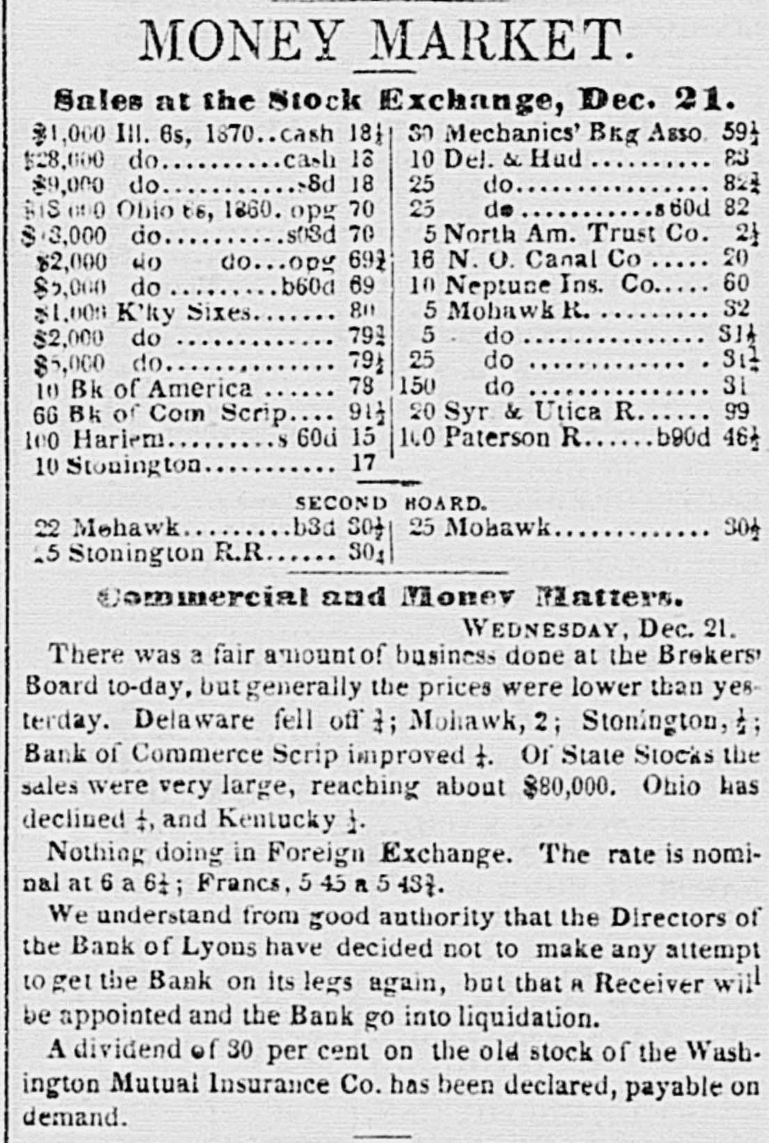 # MONEY MARKET. Sales at the Stock Exchange, Dec. 21. $1,000 Ill. 6s, 1870..cash 18½ 30 Mechanics' Bkg Asso. 59½ $28,000 docash 18 10 Del. & Hud 83 $9,000 do.8d 18 25 do. 82½ $18 000 Ohio 6s, 1860. opg 70 25 do.860d 82 $3,000 do.s03d 70 5 North Am. Trust Co. 2½ $2,000 do do...opg 69½ 16 N. O. Canal Co 20 $5,000 do...b60d 69 10 Neptune Ins. Co 60 $1,000 K'ky Sixes.. 80 5 Mohawk R. 32 $2,000 do .. 79½ 5 do .. 31¼ $5,000 do.. 79½ 25 do .. 31½ 10 Bk of America ... 78 150 do .. 31 66 Bk of Com Scrip.... 91½ 20 Syr & Utica R. 99 100 Harlem.s 60d 15 100 Paterson R.b90d 46½ 10 Stonington.. 17 SECOND HOARD. 22 Mohawk....b3d 30¼ 25 Mohawk. 30¼ 5 Stonington R.R. 30¼ Commercial and Money Matters. WEDNESDAY, Dec. 21. There was a fair amount of business done at the Brokers' Board to-day, but generally the prices were lower than yes- terday. Delaware fell off ¼; Mohawk, 2; Stonington, ½; Bank of Commerce Scrip improved ¼. Of State Stocks the sales were very large, reaching about $80,000. Ohio has declined ¼, and Kentucky ¼. Nothing doing in Foreign Exchange. The rate is nomi- nal at 6 a 6½; Francs, 5 45 a 5 43. We understand from good authority that the Directors of the Bank of Lyons have decided not to make any attempt to get the Bank on its legs again, but that a Receiver will be appointed and the Bank go into liquidation. A dividend of 30 per cent on the old stock of the Wash- ington Mutual Insurance Co. has been declared, payable on demand.