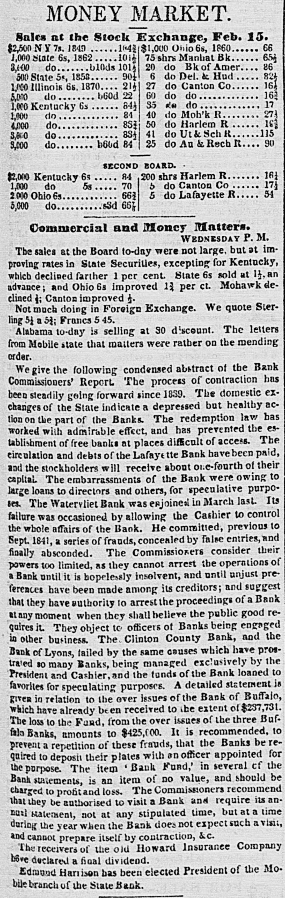 # MONEY MARKET. Sales at the Stock Exchange, Feb. 15. $2,500 N Y 7s. 1849 .164½ $1,000 Ohio 6s, 1860. 66 1,000 State 6s, 1862101½ 75 shrs Manhat Bk. 65¾ 3,000 do..blods 101¼ 20 do Bk of Amer.... 86 500 State 5s, 1858. 90¼ 6 do Del. & Hud 82½ 1,000 Illinois 6s, 1870.... 21½ 27 do Canton Co. 16¼ 5,000 do..b60d 22 60 do do. 16½ 1,000 Kentucky 6s.. 84 35 do do 17 1,000 do 84 40 do Moh'k R.... 27½ 4,000 do 85¾ 50 do Harlem R 16¾ 3,000 do 83¼ 41 do Ut & Sch R.115 5,000 do... b6od 84 25 do Au & Rech R.... 90 SECOND BOARD. $2,000 Kentucky 6s 84 200 shrs Harlem R.. 16½ 1,000 do 5s 70 5 do Canton Co. 17¼ 2.000 Ohio 6s. 66½ 5 do Lafayette R 54 5,000 dossd 66½ # Commercial and Money Matters. WEDNESDAY P. M. The sales at the Board to-day were not large, but at im- proving rates in State Securities, excepting for Kentucky, which declined farther 1 per cent. State 6s sold at 1½, an advance; and Ohio 6s improved 1½ per ct. Mohawk de- clined ¼; Canton improved ½. Not much doing in Foreign Exchange. We quote Ster- ling 5¼ a 5½; Francs 5 45. Alabama to-day is selling at 30 discount. The letters from Mobile state that matters were rather on the mending order. We give the following condensed abstract of the Bank Commissioners' Report. The process of contraction has been steadily going forward since 1839. The domestic ex- changes of the State indicate a depressed but healthy ac- tion on the part of the Banks. The redemption law has worked with admirable effect, and has prevented the es- tablishment of free banks at places difficult of access. The circulation and debts of the Lafayette Bank have been paid, and the stockholders will receive about one-fourth of their capital. The embarrassments of the Bank were owing to large loans to directors and others, for speculative purpo- ses. The Watervliet Bank was erjoined in March last. Its failure was occasioned by allowing the Cashier to control the whole affairs of the Bank. He committed, previous to Sept. 1841, a series of frauds, concealed by false entries, and finally absconded. The Commissioners consider their powers too limited, as they cannot arrest the operations of a Bank until it is hopelessly insolvent, and until unjust pre- ferences have been made among its creditors; and suggest that they have authority to arrest the proceedings of a Bank at any moment when they shall believe the public good re- quires it. They object to officers of Banks being engaged in other business. The Clinton County Bank, and the Bank of Lyons, failed by the same causes which have pros- trated so many Banks, being managed exclusively by the President and Cashier, and the funds of the Bank loaned to favorites for speculating purposes. A detailed statement is given in relation to the over issues of the Bank of Buffalo, which have already been received to the extent of $287,731. The loss to the Fund, from the over issues of the three Buf- falo Banks, amounts to $425,000. It is recommended, to prevent a repetition of these frauds, that the Banks be re- quired to deposit their plates with an officer appointed for the purpose. The item 'Bank Fund,' in several of the Bank statements, is an item of no value, and should be charged to profit and loss. The Commissioners recommend that they be authorised to visit a Bank and require its an- nual statement, not at any stipulated time, but at a time during the year when the Bank does not expect such a visit, and cannot prepare itself by contraction, &c. The receivers of the old Howard Insurance Company have declared a final dividend. Edmund Harrison has been elected President of the Mo- bile branch of the State Bank.