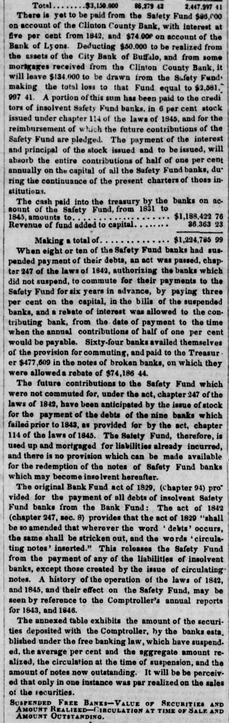 Total $3,150.000 86,279 42 2,447,997 41 There is yet to be paid from the Safety Fund $86,000 on account of the Clinton County Bank, with interest at five per cent from 1842, and $74.00 on account of the Bank of Lyons. Deducting $50.000 to be realized from the assets of the City Bank of Buffalo, and from some mortgages received from the Clinton County Bank, it will leave $134.000 to be drawn from the Safety Fund making the total loss to that Fund equal to $2,581, 997 41. A portion of this sum has been paid to the credi tors of insolvent Safety Fund banks. in 6 per cent stock issued under chapter 114 of the laws of 1845, and for the reimbursement of which the future contributions of the Safety Fund are pledged. The payment of the interest and principal of the stock issued and to be issued, will absorb the entire contributions of half of one per cent annually on the capital of all the Safety Fund banks, du ring the continuance of the present charters of those institutions. The cash paid into the treasury by the banks on acaount of the Safety Fund, from 1831 to $1,188,422 76 1845, amounts to 36.363 23 Revenue of fund added to capital $1,224,795 99 Making a total of When eight or ten of the Safety Fund banks had suspended payment of their debts, an act was passed, chap. ter 247 of the laws of 1842, authorizing the banks which did not suspend, to commute for their payments to the Safety Fund for six years in advance, by paying three per cent on the capital, in the bills of the suspended banks, and a rebate of interest was allowed to the contributing bank, from the date of payment to the time when the annual contributions of half of one per cent would be payable. Sixty-four banks availed themselves of the provision for commuting, and paid to the Treasur er $477,609 in the notes of broken banks, on which they were allowed a rebate of $74,186 44. The future contributions to the Safety Fund which were not commuted for, under the act, chapter 247 of the laws of 1842, have been anticipated by the issue of stock for the payment of the debts of the nine banks which failed prior to 1843, as provided for by the act, chapter 114 of the laws of 1845. The Safety Fund, therefore, is used up and mortgaged for liabilities already incurred, and there is no provision which can be made available for the redemption of the notes of Safety Fund banks which may become insolvent hereafter. The original Bank Fund act of 1829, (chapter 94) pro* vided for the payment of all debts of insolvent Safety Fund banks from the Bank Fund: The act of 1842 (chapter 247, sec. 8) provides that the act of 1829 "shall be so amended that wherever the word debts' occurs, the same shall be stricken out, and the words circulating notes' inserted." This releases the Safety Fund from the payment of any of the liabilities of insolvent banks, except those created by the issue of circulating notes. A history of the operation of the laws of 1842, and 1845, and their effect on the Safety Fund, may be seen by reference to the Comptroller's annual reports for 1843, and 1846. The annexed table exhibits the amount of the securities deposited with the Comptroller, by the banks esta. blished under the free banking law, which have suspended, the average per cent and the aggregate amount realized, the circulation at the time of suspension, and the amount of notes now outstanding. It will be be perceived that only in one instance was par realized on the sales of the securities. SUSPENDED FREE BANKS-VALUE OF SECURITIES AND AMOUNT REALIZED-CIRCULATION AT TIME OF SALE AND AMOUNT OUTSTANDING.