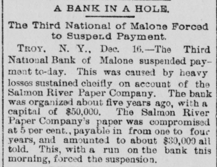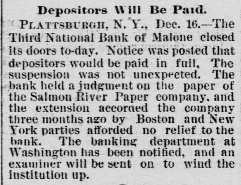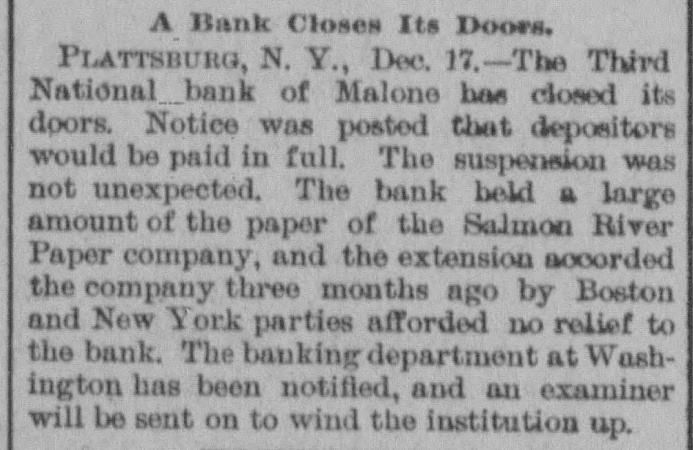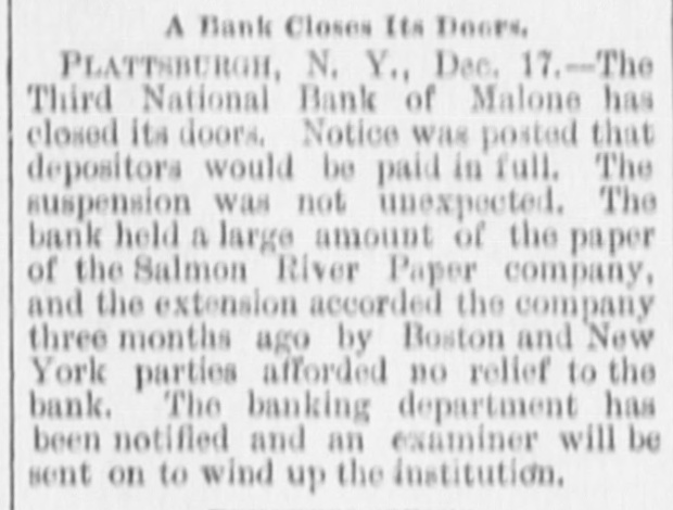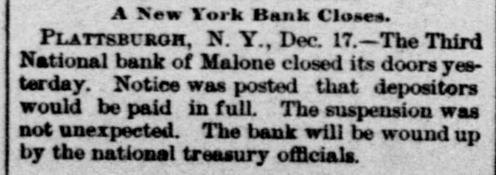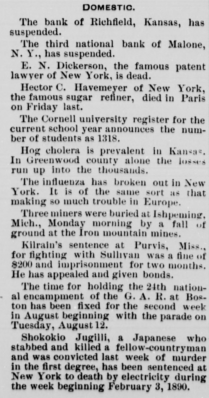 DOMESTIC. The bank of Richfield, Kansas, has suspended. The third national bank of Malone, N. Y., has suspended. E. N. Dickerson, the famous patent lawyer of New York, is dead. Hector C. Havemeyer of New York, the famous sugar refiner, died in Paris on Friday last. The Cornell university register for the current school year announces the number of students as 1318. Hog cholera is prevalent in Kansas. In Greenwood county alone the losses run up into the thousands. The influenza has broken out in New York. It is of the same sort as that making so much trouble in Europe. Three miners were buried at Ishpeming, Mich., Monday morning by a fall of ground at the Iron mountain mines. Kilrain's sentence at Purvis, Miss., for fighting with Sullivan was a fine of $200 and imprisonment for two months. He has appealed and given bonds. The time for holding the 24th national encampment of the G. A. R. at Boston has been fixed for the second week in August beginning with the parade on Tuesday, August 12. Shokokio Jugilli, a Japanese who stabbed and killed a fellow-countryman and was convicted last week of murder in the first degree, has been sentenced at New York to death by electricity during the week beginning February 3, 1890.