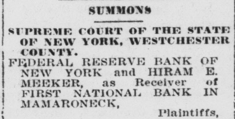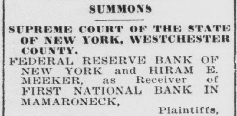 SUMMONS SUPREME COURT OF THE STATE OF NEW YORK, WESTCHESTER COUNTY. FEDERAL RESERVE BANK OF NEW YORK and HIRAM E. MEEKER, as Receiver of FIRST NATIONAL BANK IN MAMARONECK, Plaintiffs,