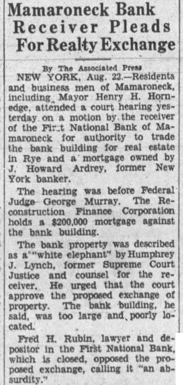 NEW YORK, Aug. 22 Residents business men of Mamaroneck including Henry Hornedge. attended court yesterday on motion by receiver the First National Bank of Mamaroneck for authority to trade the bank building for real estate in Rye and mortgage owned by Howard Arformer New York banker The hearing was before Federal Judge George Murray The Re construction Finance Corporation holds mortgage against the building The bank property described "white elepnant Humphrey Lynch, former Court and for the receiver He urged that the court approve the exchange property. The back building. he poorly cated. Fred H. Rubin. and depositor National Bank. which the proposed exchange, calling it absurdity.