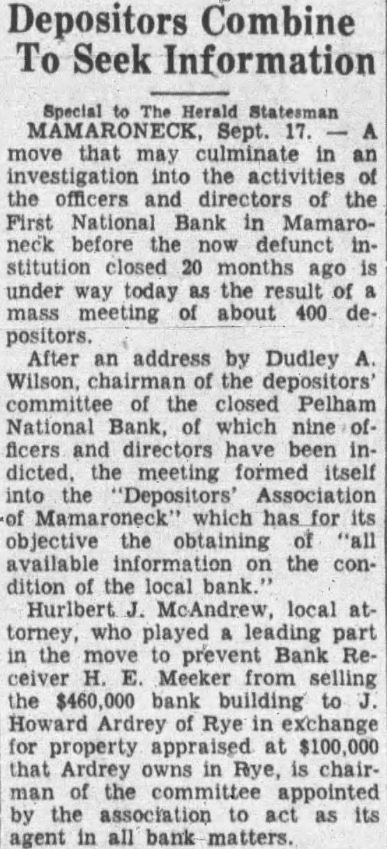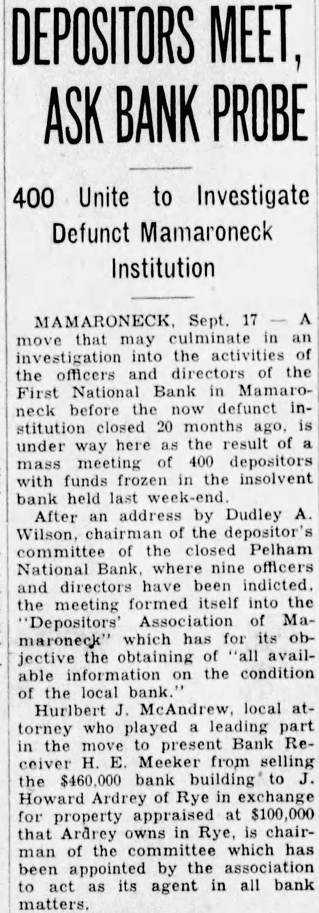 Special Herald MAMARONECK, Sept. 17. A move that may in an investigation into the activities of the officers and of the First National Bank in Mamaroneck before the defunct institution closed 20 months ago is under way today as the result of mass meeting of about 400 depositors. After an address by Dudley A Wilson, chairman of the depositors committee of the closed Pelham National Bank, of which nine officers and directors have been indicted, the meeting formed itself into the 'Depositors' Association of Mamaroneck' which has for its objective the obtaining of "all available information on the condition the local bank. Hurlbert McAndrew, local attorney, who played leading part in the move to prevent Bank Receiver H. E. Meeker from selling the $460,000 bank building to Howard Ardrey of Rye in exchange for property appraised at $100,000 that Ardrey owns in Rye, is chair man of the appointed by the to act as its agent in all bank matters.