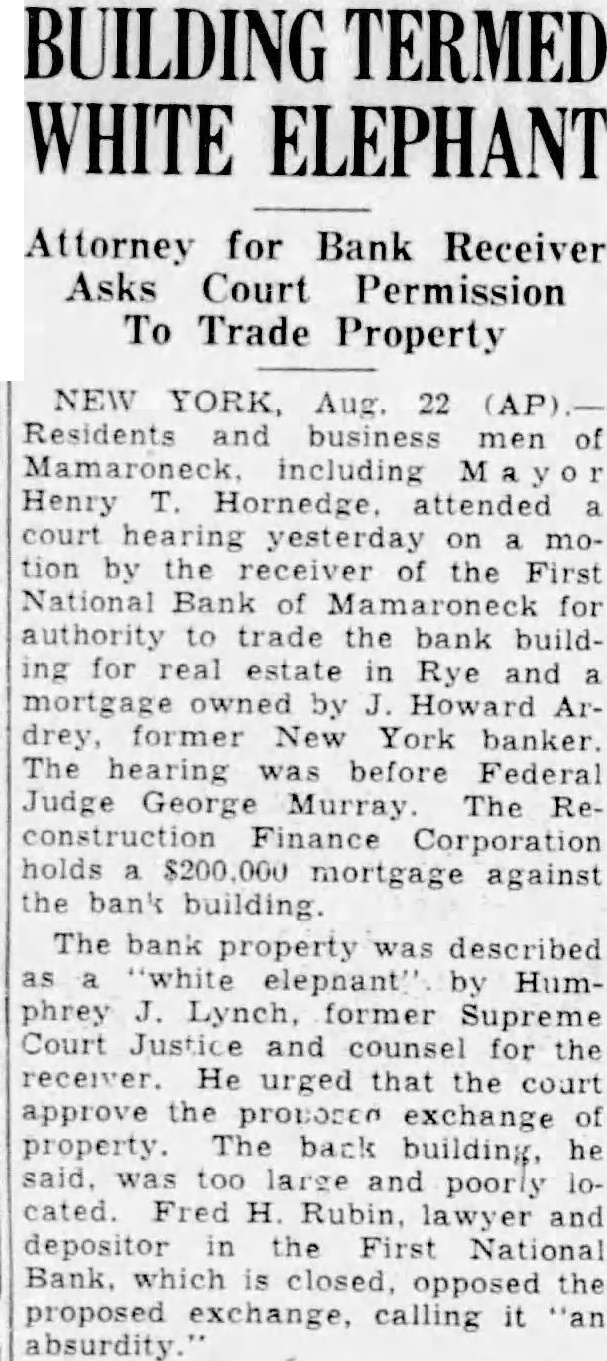 The Associated Press NEW YORK, Aug. and business men of Mamaroneck, Henry H. Hornincluding edge, attended court hearing yesmotion by the of the First National Bank of Mamaroneck for trade the bank building for real estate Rye owned by Howard Ardrey, former New York banker. The hearing was before Federal Judge George Murray. The Reconstruction Finance Corporation holds $200,000 mortgage against the bank building. The bank property was described elephant" Humphrey former Supreme Court Lynch, Justice and counsel for the reHe urged that the court ceiver. approve the proposed exchange The bank building, property. said, was too large and poorly cated.
