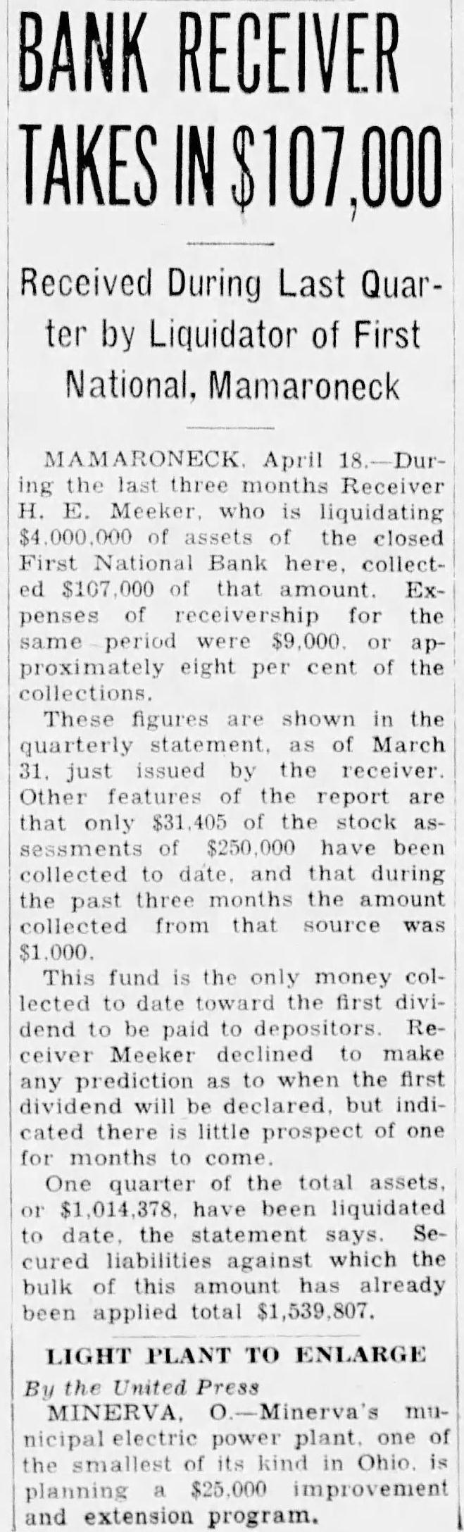 MAMARONECK April During the last three Receiver H. E. Meeker who is liquidating $4 of the closed First Bank here collected that amount Expenses of for the same period 000 or proximately eight per cent of the These figures shown the quarterly statement. of March just issued by the receiver Other of the report are that only the stock assessments have been collected to date. and that during the past three months the amount collected from that source was This fund is the only money collected to date first dividend to be paid depositors Receiver Meeker declined to make any prediction as when the first dividend will declared. but indicated there little prospect of one for months to come One quarter of the total assets $1,014,378. have been liquidated to date. the statement says. Secured liabilities against which the bulk this amount has already been applied total