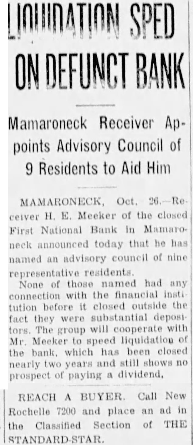 MAMARONECK, Oct. ceiver H. E. Meeker of the closed First National Bank in Mamaroneck announced today that he has named an advisory council of nine representative residents. None of those named had any connection with the financial insti tution before it closed outside the fact they were substantial depositors. The group will cooperate with Mr. Meeker to speed liquidation of the bank. which has been closed nearly two years and still shows no prospect of paying dividend.