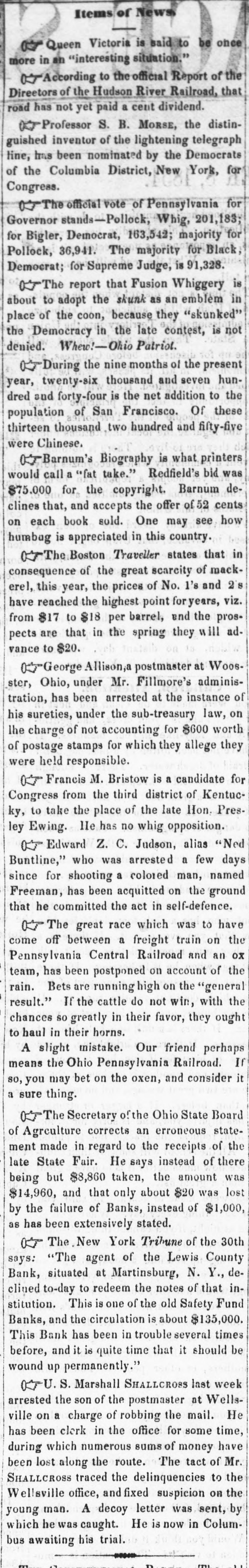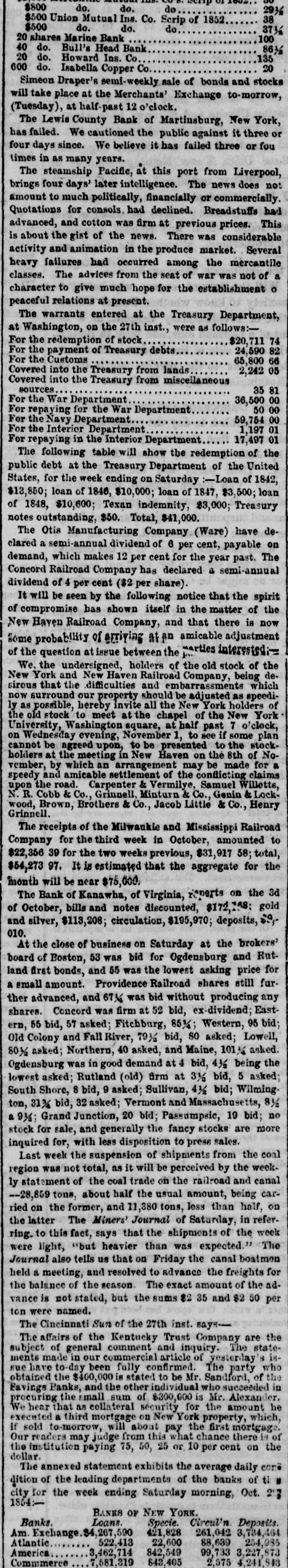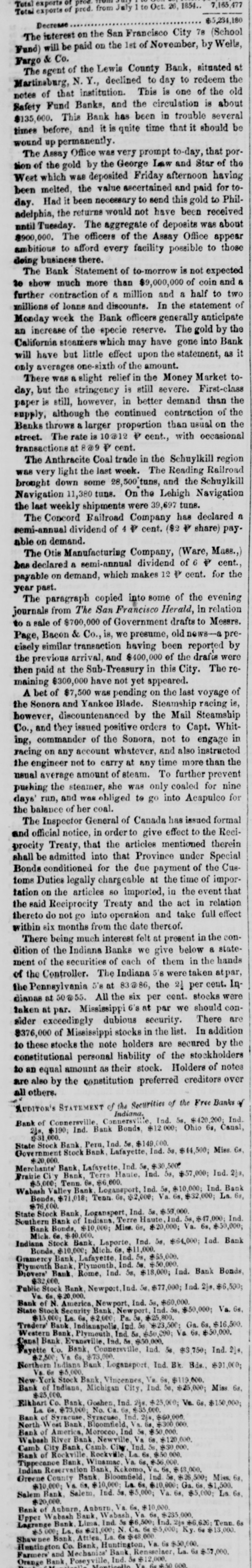 $5,234,180 Decrease The interest on the San Francisco City 78 (School Fund) will be paid on the 1st of November, by Wells, Fargo & Co. The agent of the Lewis County Bank, situated at Martinsburg, N. Y., declined to day to redeem the notes of that institution. This is one of the old Safety Fund Banks, and the circulation is about $135,000. This Bank has been in trouble several times before, and it is quite time that it should be wound up permanently. The Assay Office was very prompt to-day, that portion of the gold by the George Law and Star of the West which was deposited Friday afternoon having been melted, the value ascertained and paid for today. Had it been necessary to send this gold to Philadelphia, the returns would not have been received nntil Tuesday. The aggregate of deposits was about $900,000. The officers of the Assay Office appear smbitious to afford every facility possible to those doing business there. The Bank Statement of to-morrow is not expected to show much more than $9,000,000 of coin and a further contraction of a million and a half to two millions of loans and discounts. In the statement of Monday week the Bank officers generally anticipate an increase of the specie reserve. The gold by the California steamers which may have gone into Bank will have but little effect upon the statement, as it only averages one-sixth of the amount. There was a slight relief in the Money Market today, but the stringency is still severe. First-class paper is still, however, in better demand than the supply, although the continued contraction of the Banks throws a larger propertion than usual on the street. The rate is 10@12 P cent., with occasional transactions at 8@9 P cent. The Anthracite Coal trade in the Schuylkill region was very light the last week. The Reading Railroad brought down some 28,500 tuns, and the Schuylkill Navigation 11,380 tuns. On the Lehigh Navigation the last weekly shipments were 39,697 tuns. The Concord Bailroad Company has declared a semi-annual dividend of 4 P cent. ($2 P share) payable on demand. The Otis Manufacturing Company, (Ware, Mass.,) has declared a semi-annual dividend of 6 P cent., payable on demand, which makes 12 P cent. for the year past. The paragraph copied into some of the evening journals from The San Francisco Herald, in relation to a sale of $700,000 of Government drafts to Messrs. Page, Bacon & Co., is, we presume, old news-a previsely similar transaction having been reported by the previous arrival, and $400,000 of the drafts were then paid at the Sub-Treasury in this City. The remaining $300,000 have not yet appeared. A bet of $7,500 was pending on the last voyage of the Sonora and Yankee Blade. Steamship racing is, however, discountenanced by the Mail Steamship Co., and they issued positive orders to Capt. Whiting, commander of the Sonora, not to engage in racing on any account whatever, and also instructed the engineer not to carry at any time more than the usual average amount of steam. To further prevent pushing the steamer, she was only coaled for nine days' run, and was obliged to go into Acapulco for the balance of her coal. The Inspector General of Canada has issued formal and official notice, in order to give effect to the Reciprocity Treaty, that the articles mentioned therein shall be admitted into that Province under Special Bonds conditioned for the due payment of the Customs Duties legally chargeable at the time of importation on the articles so imported, in the event that the said Reciprocity Treaty and the act in relation thereto do not go into operation and take full effect within six months from the date thereof. There being much interest felt at present in the condition of the Indiana Banks we give below a statement of the securities of each of them in the hands of the Controller. The Indiana 5's were taken atpar, the Pennsylvania 5's at 83@86, the 21 per cent. Indianas at 50@55. All the six per cent. stocks were taken at par. Mississippi 6's at par we should consider exceedingly dubious security. There are $376,000 of Mississippi stocks in the list. In addition to these stocks the note holders are secured by the constitutional personal liability of the stockholders to an equal amount as their stock. Holders of notes are also by the constitution preferred creditors over all others. AUDITOR'S STATEMENT of the Securities of the Free Banks of Bank of Connersville, Connersville, Indiana, Ind. 5s, $420,200; Ind. 21s, $190; Ind. Bank Bonds, $12.000; Ohio 6s, Canal, $31,000. State Stock Bank Peru, Ind. 5e, $149,000. Government Stock Bank, Lafayette, Ind. 5s, $44,500; Miss 6s. Merchants' $20,000. Bank, Lafayette, Ind. 5e, 500. Prairie City Bank, Terrs Haute. Ind. 5s, $57,000; Ind. 2ja, $5,000; Tenn 6s. $6,000. Wabash Valley Bank Logansport, Ind. 5s, $10,000; Ind. Bank Bonds, $71,018; Tenn 6s, $2,000; Va. 6s, $32,000; La. 6s, State $76,000. Stock Bank, Logansport, Ind. 58, $59,000. Southern Bank of Indians, Terre Haute, Ind. 5s, $47,000; Ind. Bank Bonds, $10,000; Miss. 6s, $20,000; Va. 6s, $50,000; Mich 6s, $40,000. Indiana Stock Bank, Laporte, Ind. 5s, $64,000; Ind. Bank Bonds, $10,000; Mich. 6s, $11,000. Gramercy Bank, Lafayette Ind. 5s, $65,000. Plymouth Bank, Plymouth, Ind. 5a. $50,000. Diovers' Bank. Rome, Ind. 5s, $18,000; Ind. Bank Bonds, Public $32,000. Stock Bank, Newport,Ind. 5a, $77,000; Ind. 2je, $6,590; Va. 6s, $20,000. Bank of N. America, Newport, Ind. 5s, $60,000. State Stock Security Bank Newport, Ind. 5s, $50,000; Va. 6s, $15,000; La. 6s, $2,000; Pa. 58, $25,800. Traders' Bank Indianapolis, Ind. 5s $23,500; Ga. 6a, $16,500. Western Bank, Plymouth, Ind. 5s, $50,000; Va 6s, $50,000. Canal Bank. Evansville. Ind. 5a. $50,000. Fayette Co. Bank, Connersville, Ind. 5s, $3,750; Ind. 21s, $2,500 Va 6s, $73,000 Northern Indiana Bank Logansport, Ind. Bk. Bds., $91,000; 6s Va $5,000. New York Stock Bank, Vincennes, Va. 6s, $119,000. Bank of Indiana, Michigan City, Ind. 58, $25,000; Miss 6a. $25,000. Elkhart Co. Bank. Go