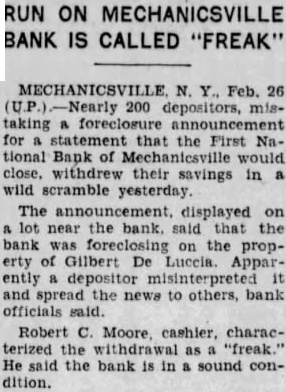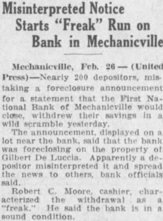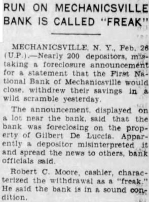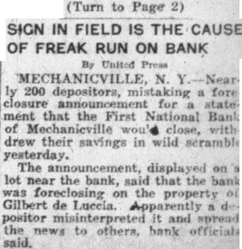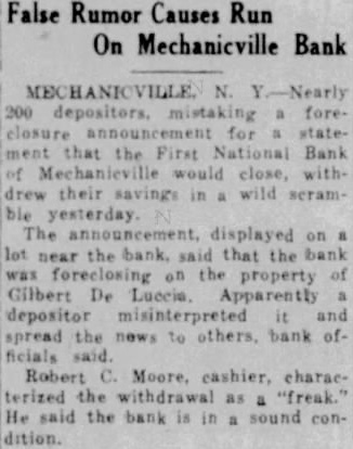 Misinterpreted Notice Starts "Freak" Run on Bank in Mechanicville