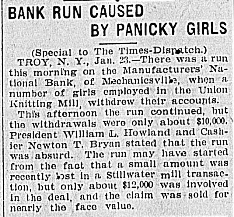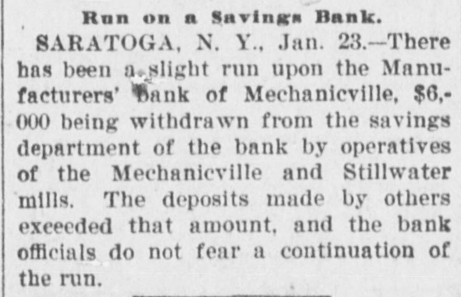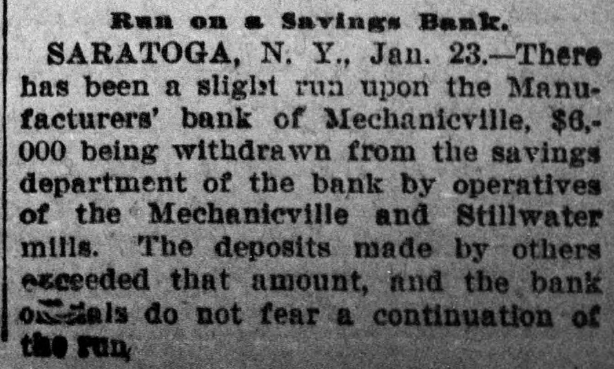 Run on s Savings Bank. SARATOGA, N. Y., Jan. 23.-There has been a slight run upon the Manufacturers' bank of Mechanicville, $6,000 being withdrawn from the savings department of the bank by operatives of the Mechanicville and Stillwater mills. The deposits made by others exceeded that amount, and the bank oketals do not fear a continuation of